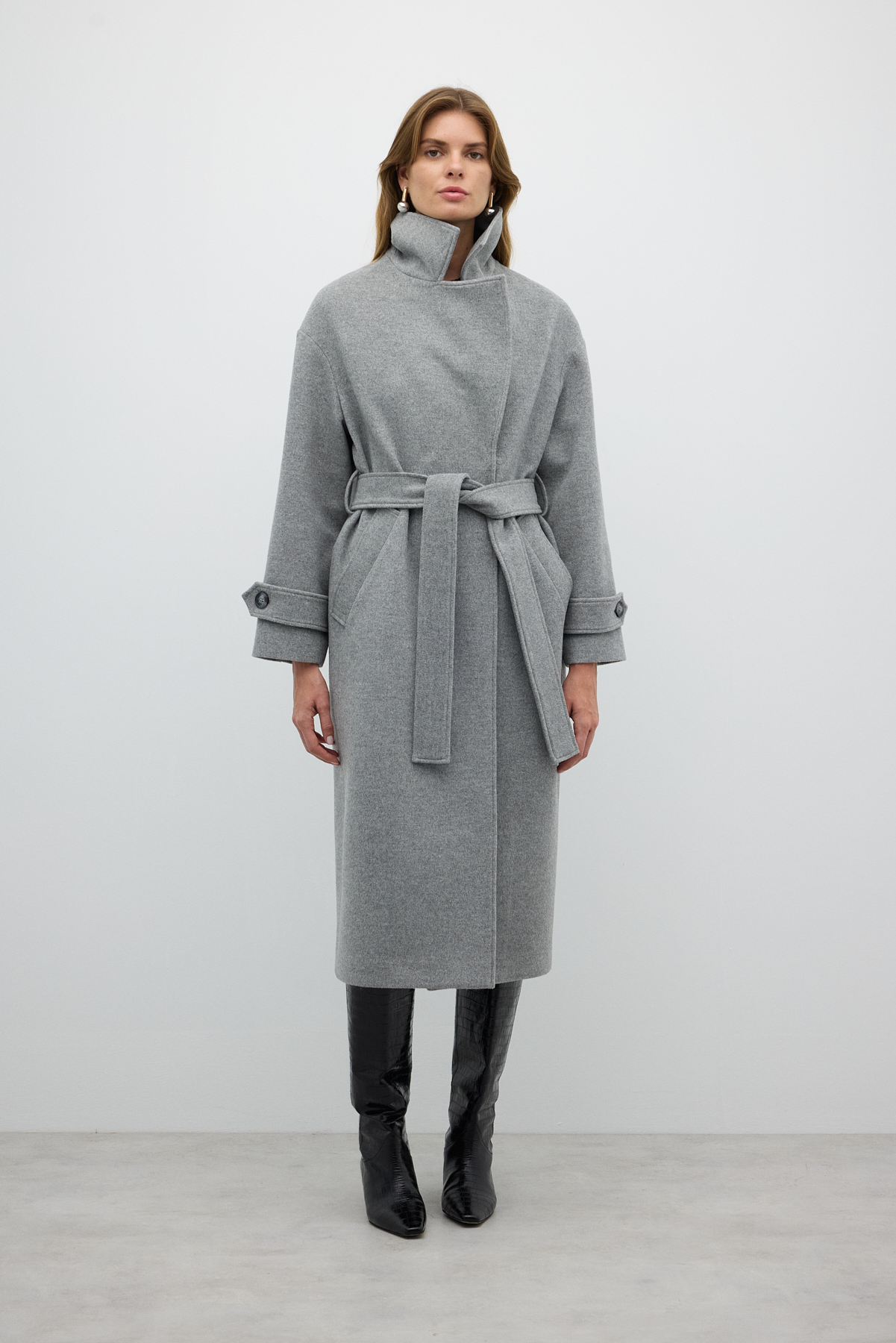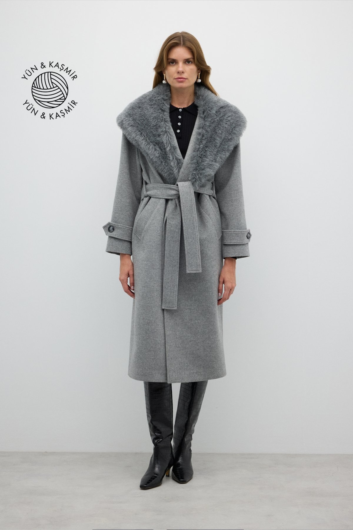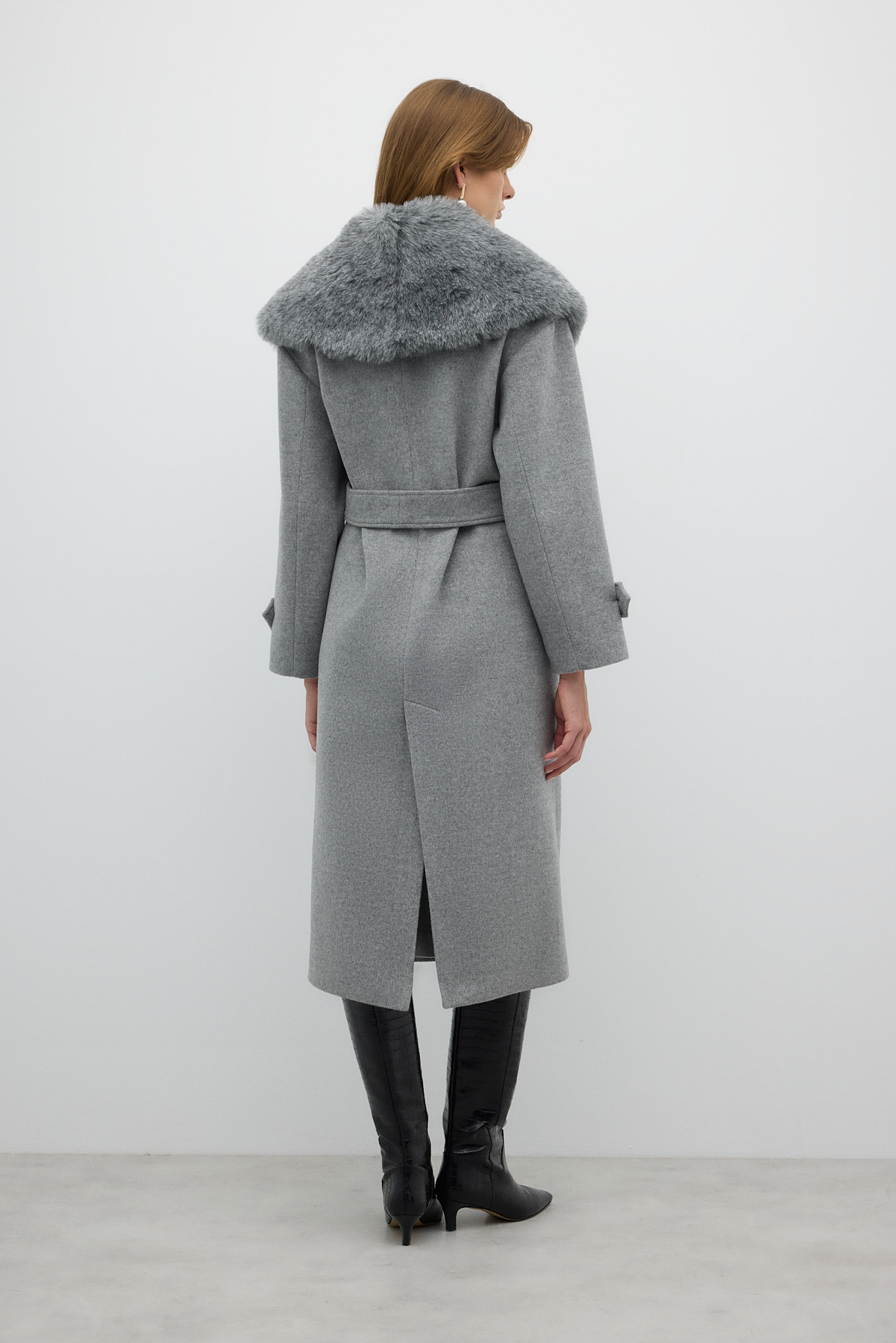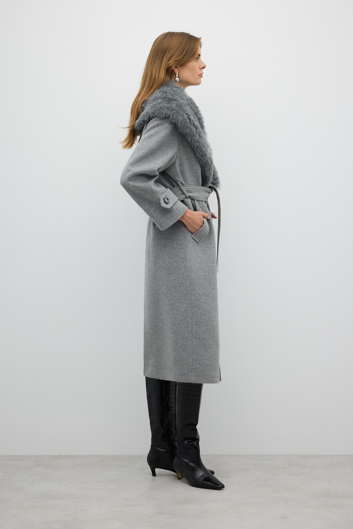 Çıkarılabilir Kürk Yakalı Kruvaze Yün Kaban Gri - 4