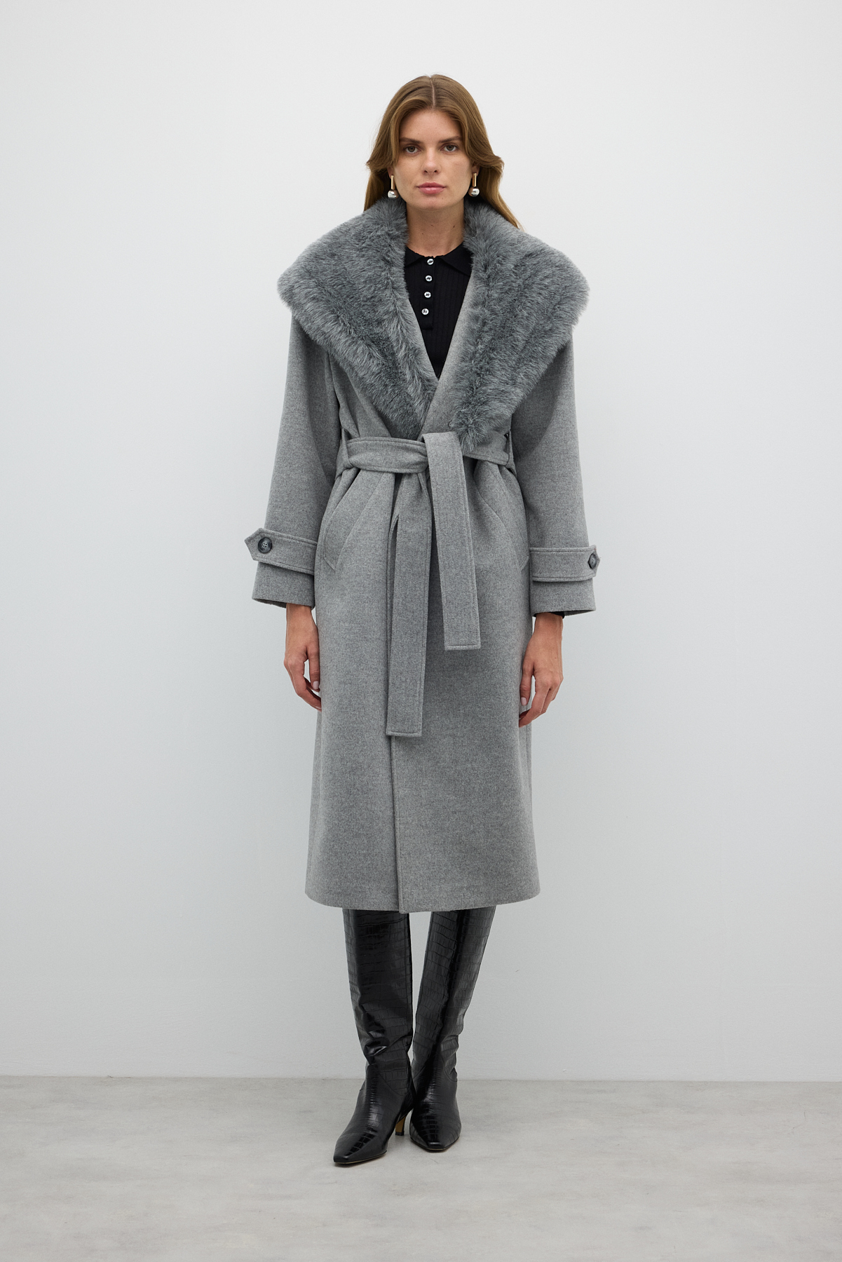 Çıkarılabilir Kürk Yakalı Kruvaze Yün Kaban Gri - 1