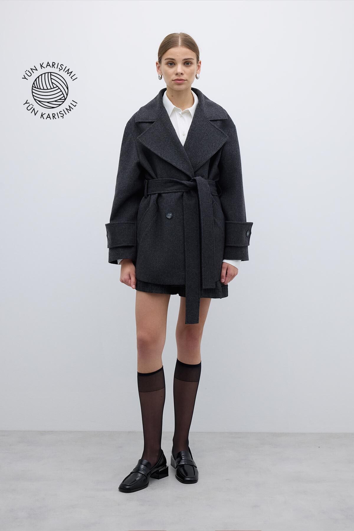 Yün Karışımlı Kruvaze Beli Kemerli Kaban Antrasit - 1