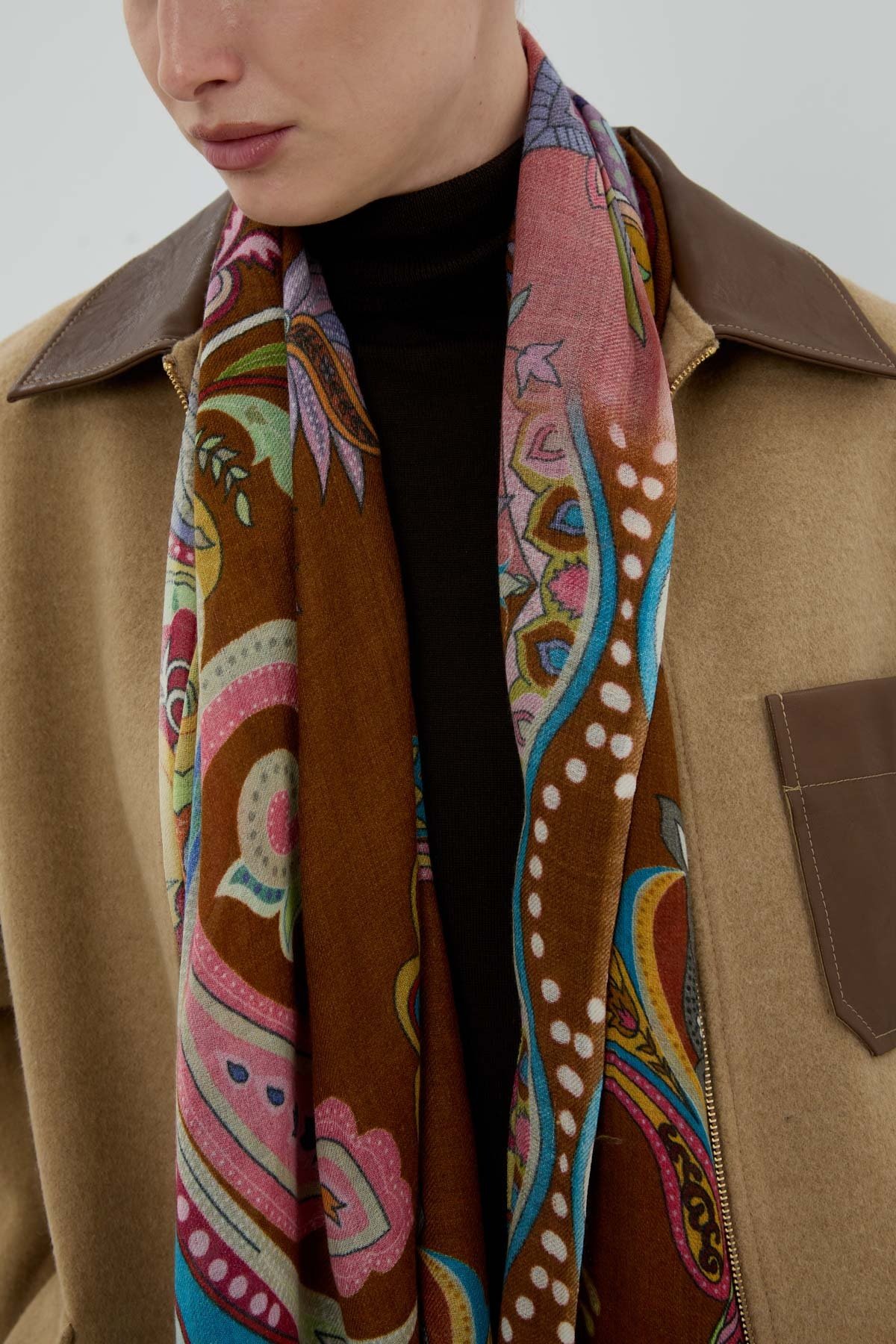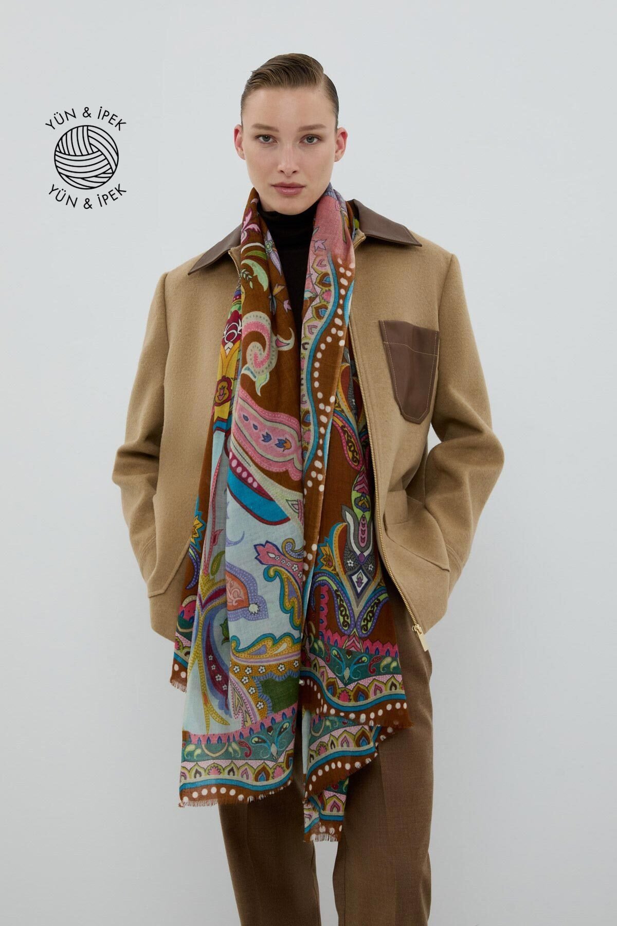 Yün ve Kaşmir Karışımlı Desenli Şal Açık Kahve