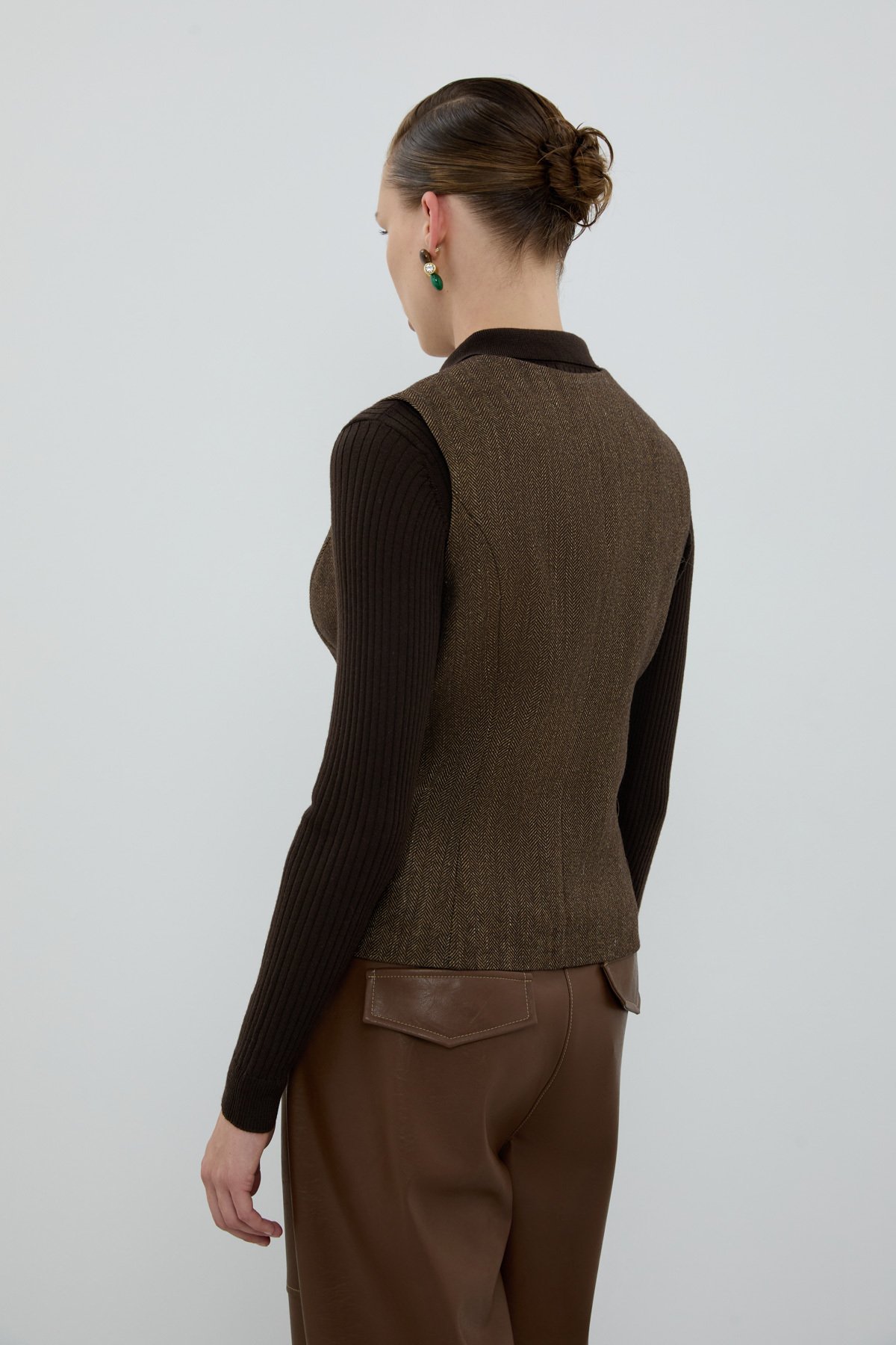 Yün Karışımlı V Yaka Önü Düğmeli Yelek Kahve - 3