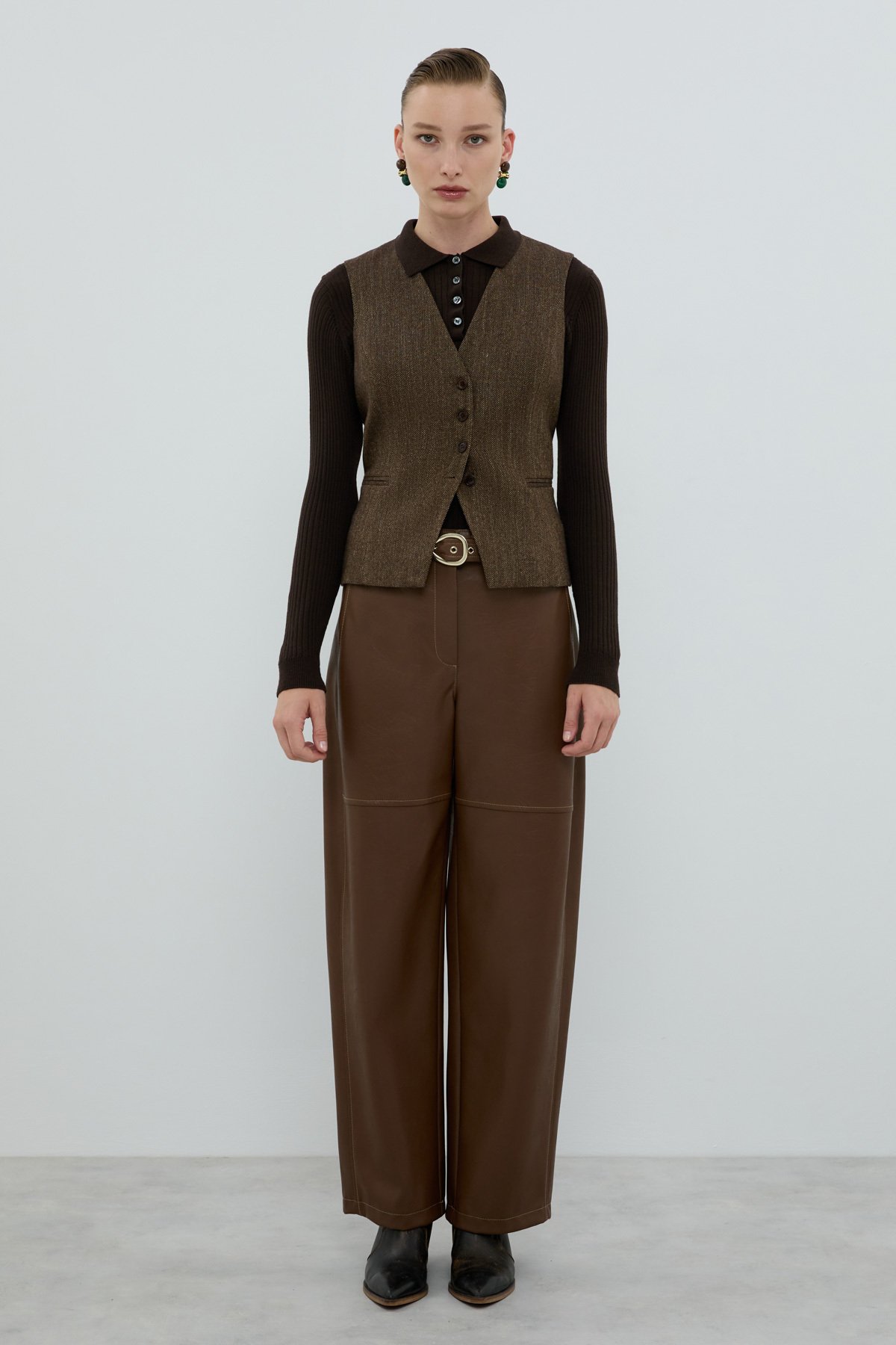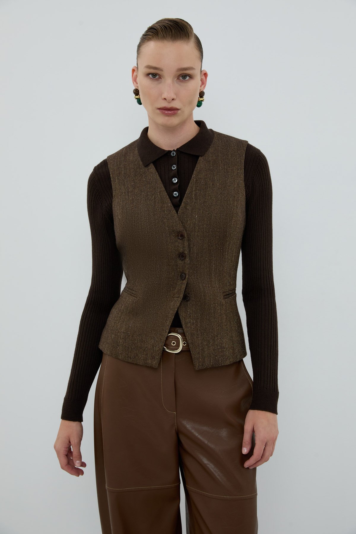 Yün Karışımlı V Yaka Önü Düğmeli Yelek Kahve - 1