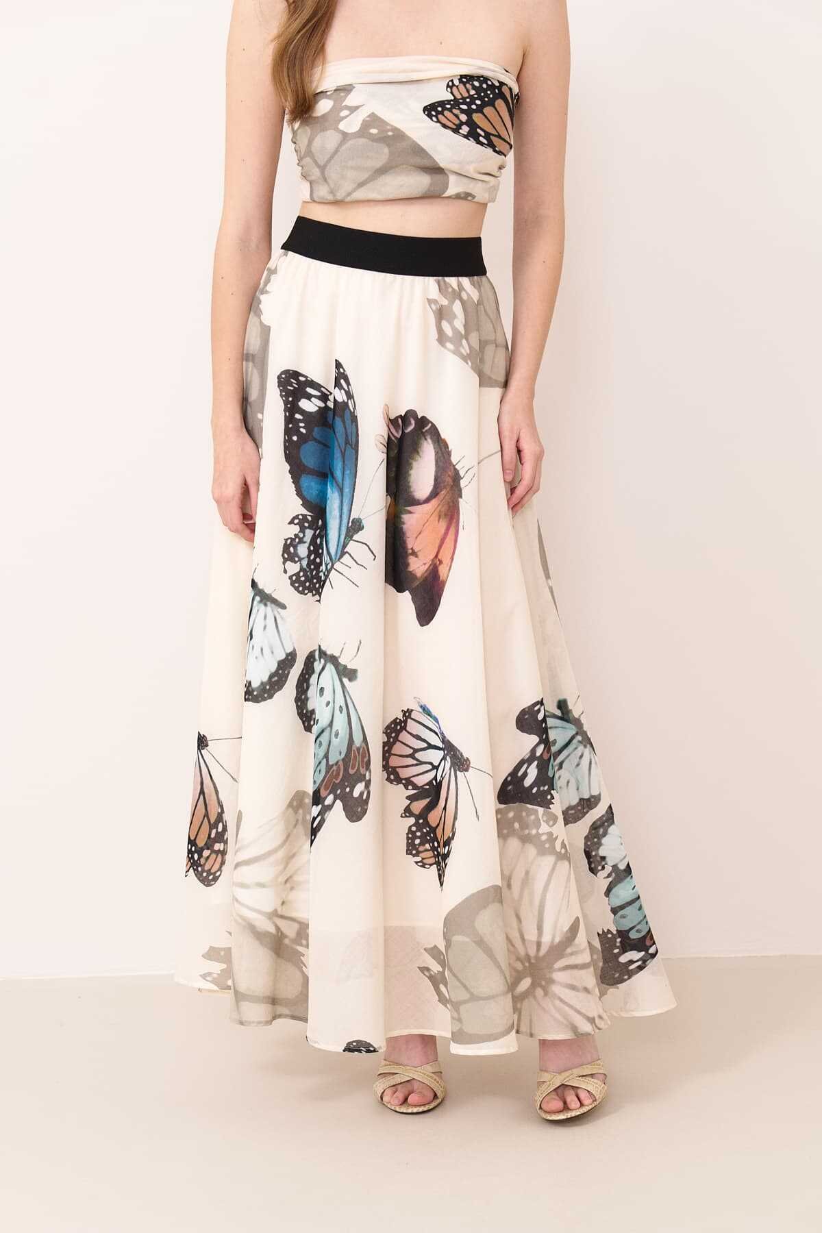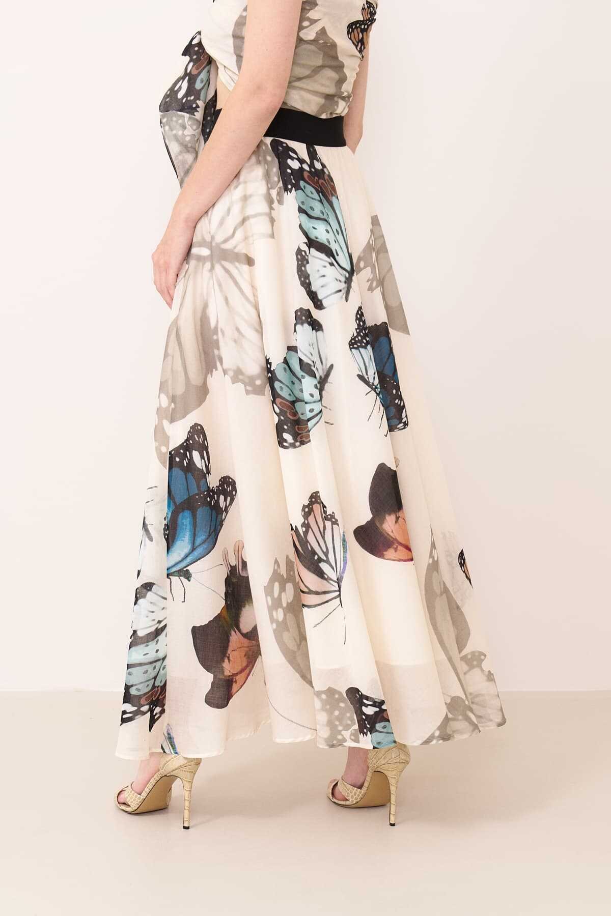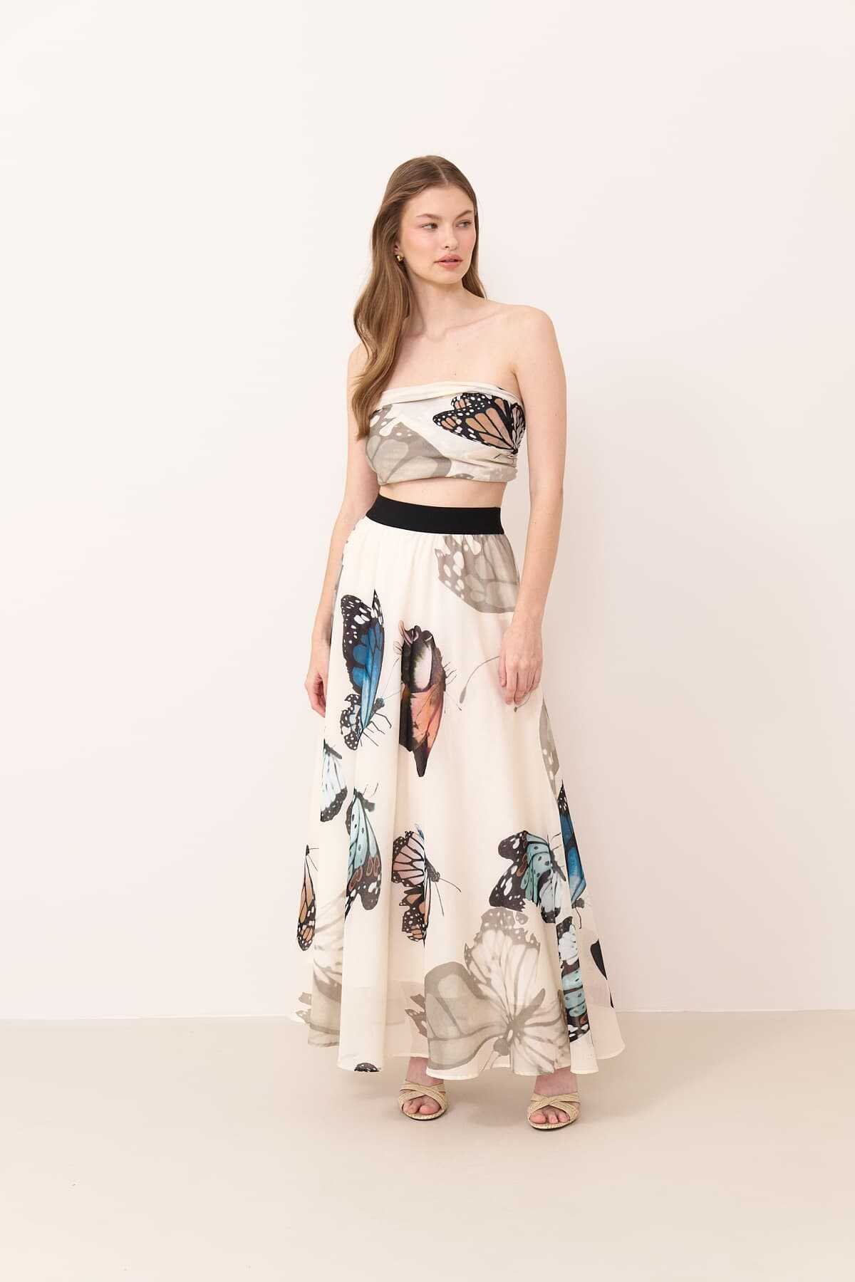 Beli lastikli kelebek desen baskılı vual etek
