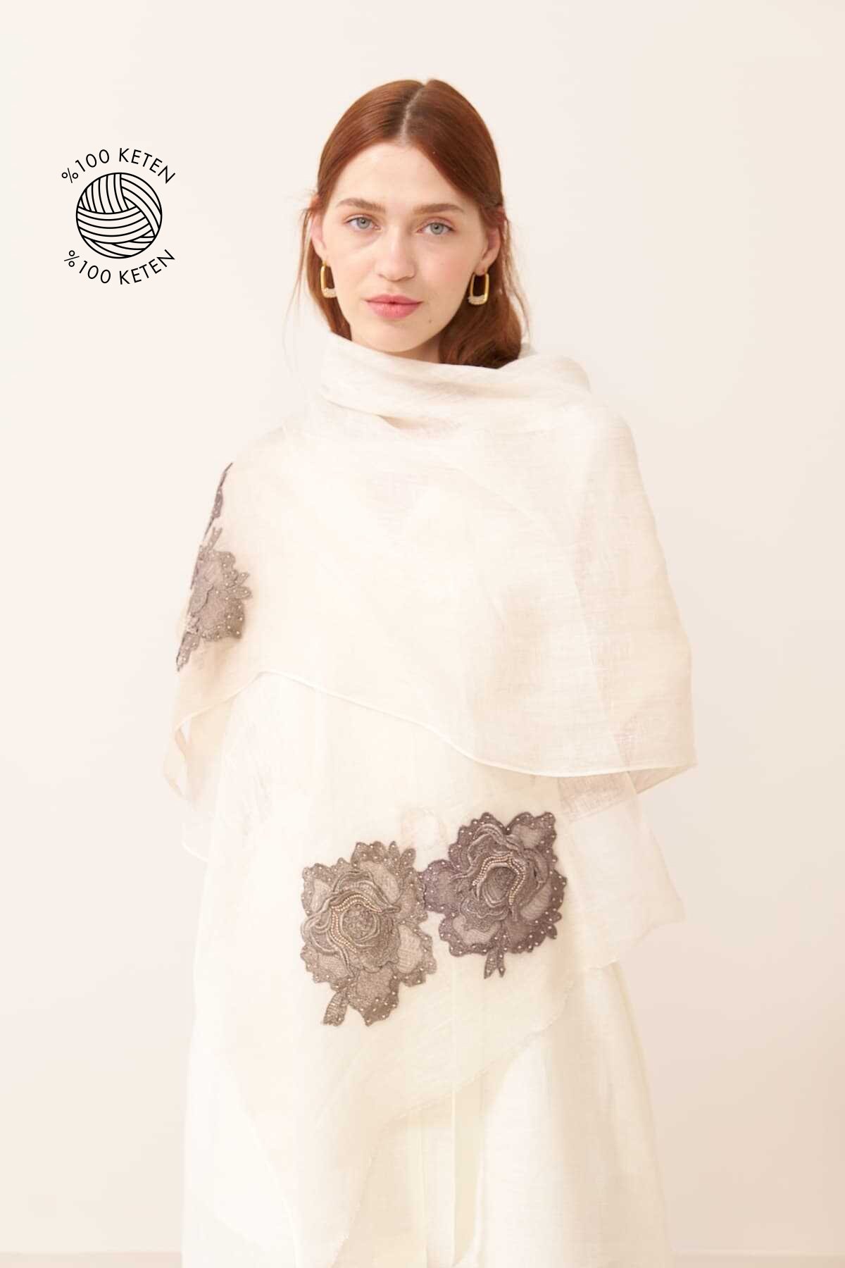 İpek ve Yün Karışımlı Desenli Şal Gri