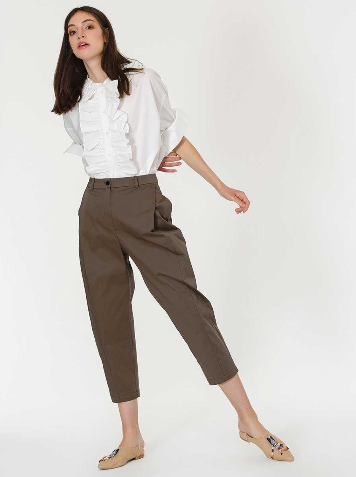 Yün Karışımlı Beli Lastikli Düz Paça Pantolon Kahve