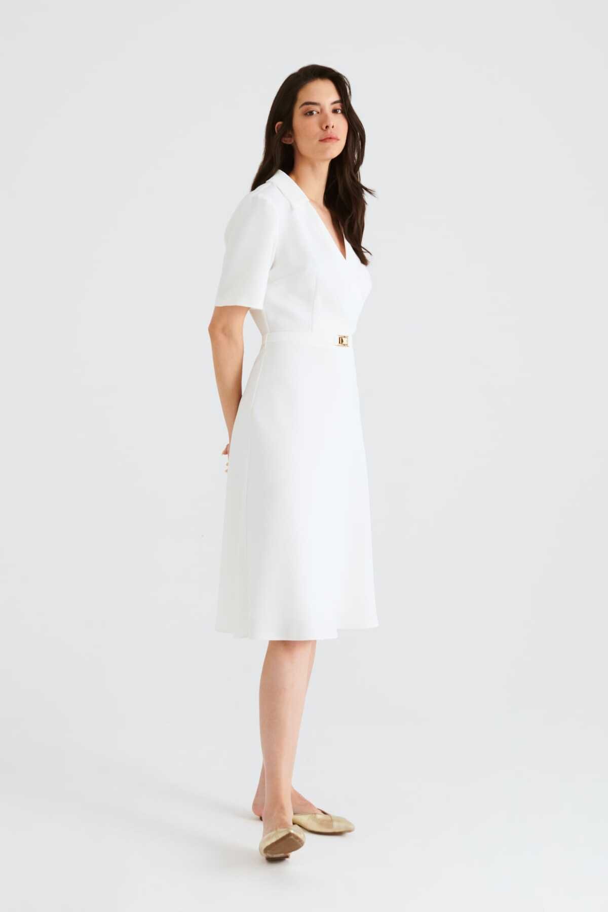 V Yaka Cup Detaylı Midi Boy Elbise Beyaz