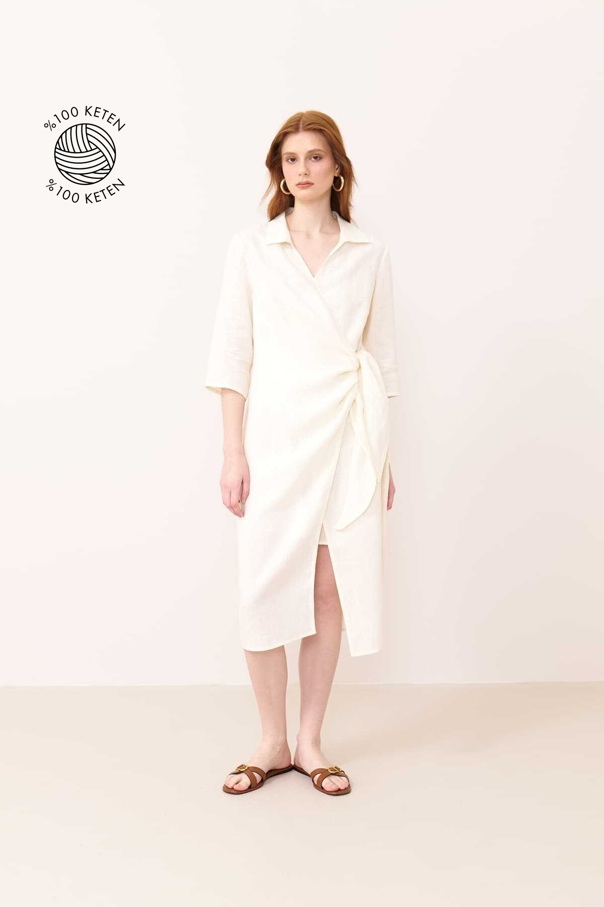 %100 Keten Kruvaze Görünümlü Beli Kemerli Midi Boy Elbise Haki