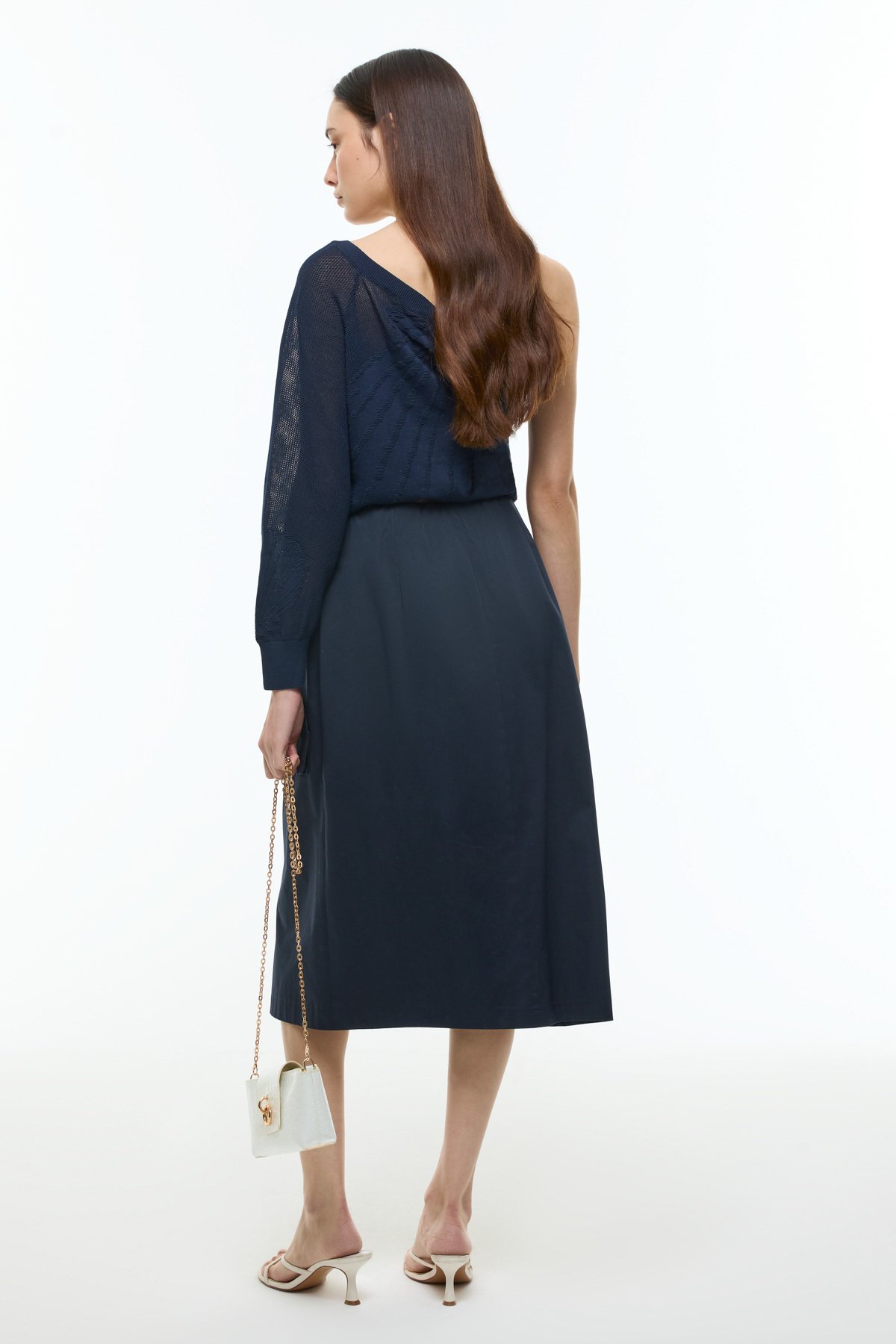 Önden Fermuarlı Çift Cepli Beli Lastikli Midi Etek Lacivert - 4