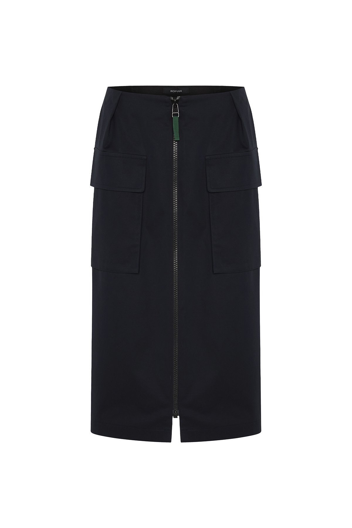 Önden Fermuarlı Çift Cepli Beli Lastikli Midi Etek Lacivert - 1