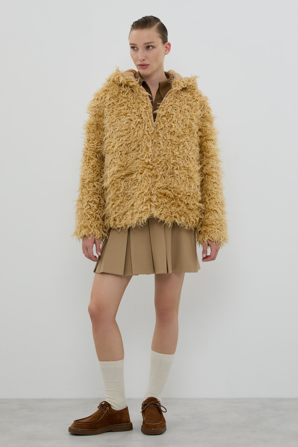 Önü Fermuarlı Kapüşonlu Mont Bej - 3