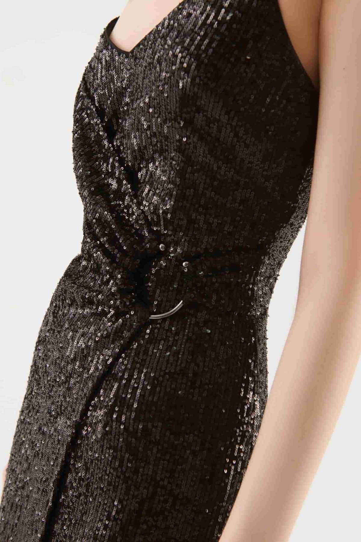 Gold Metal Aksesuarlı Derin Yırtmaçlı Maksi Boy Elbise Siyah