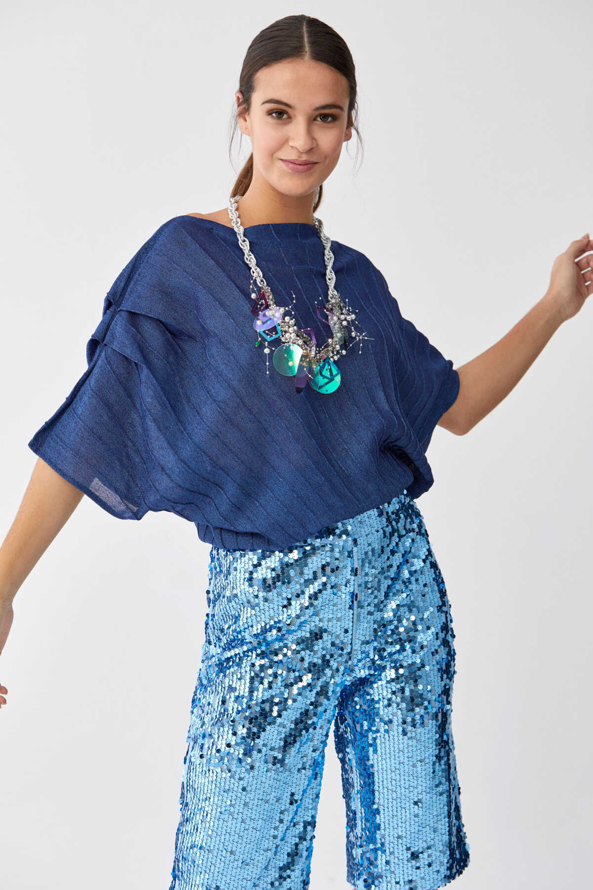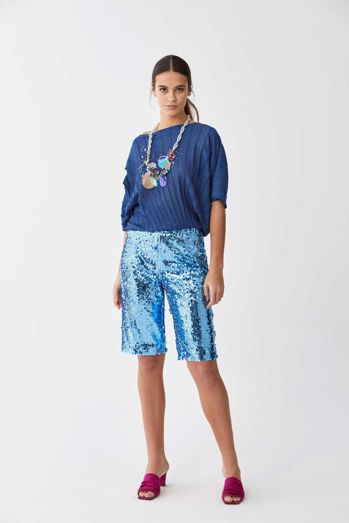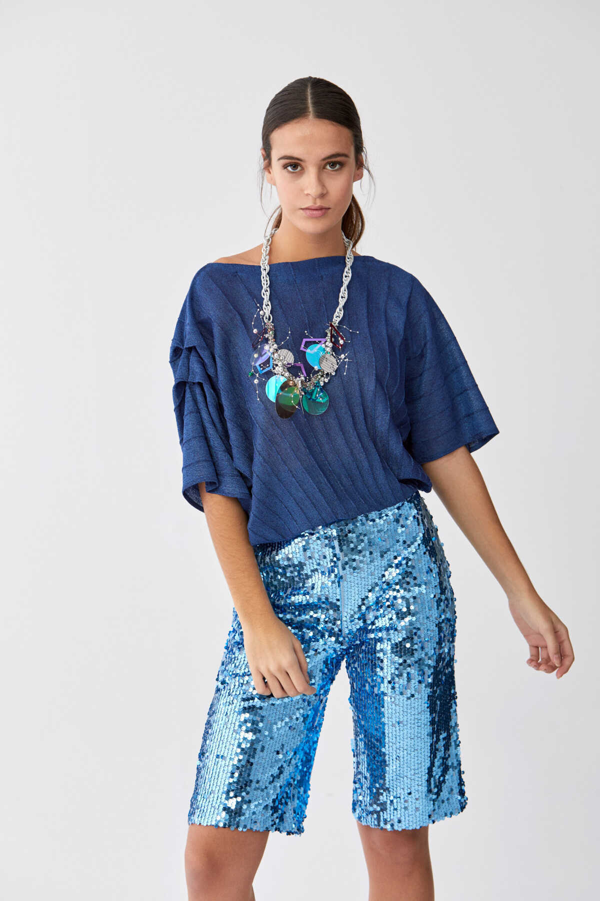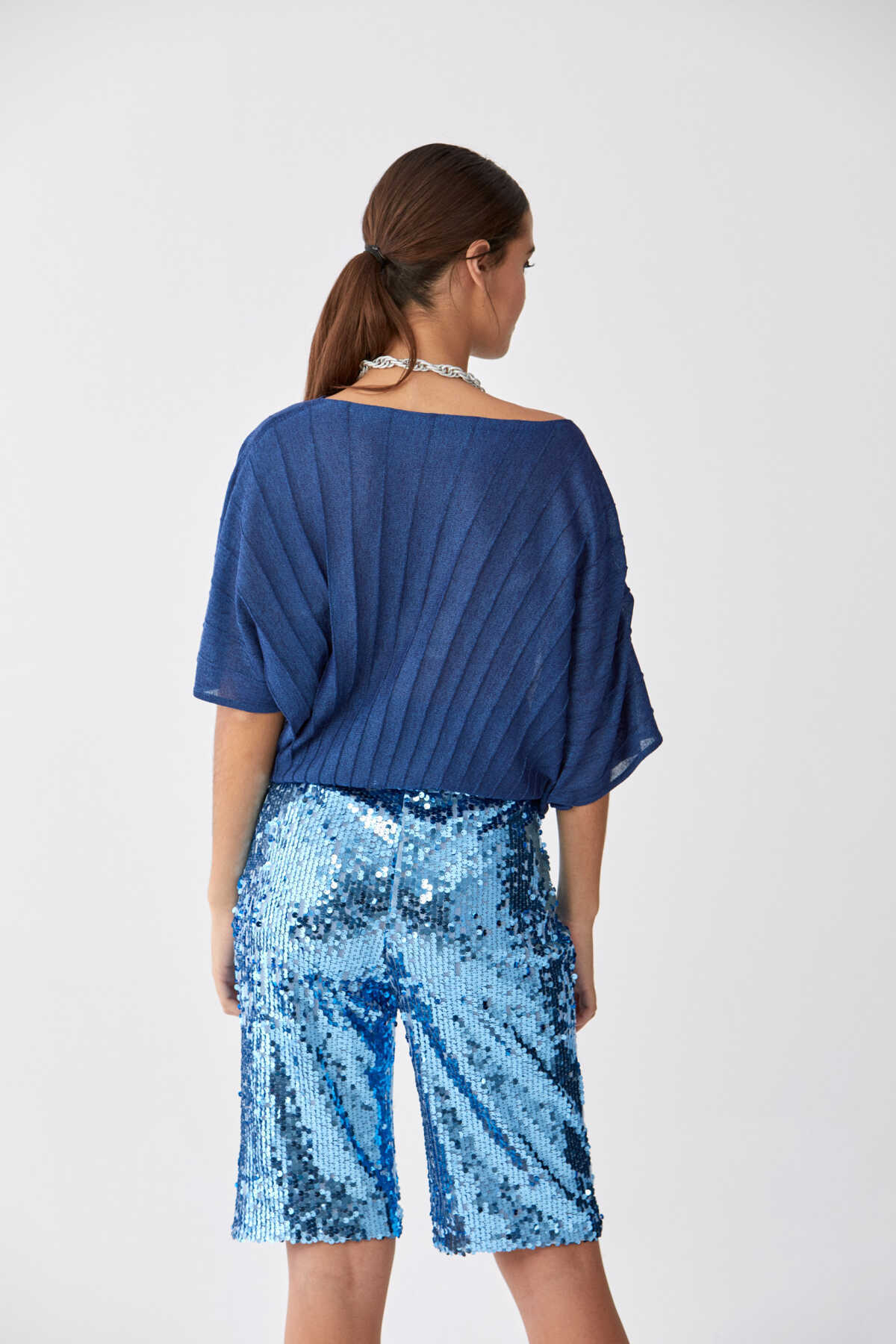 Payetli Bermuda Kadın Pantolon Mavi