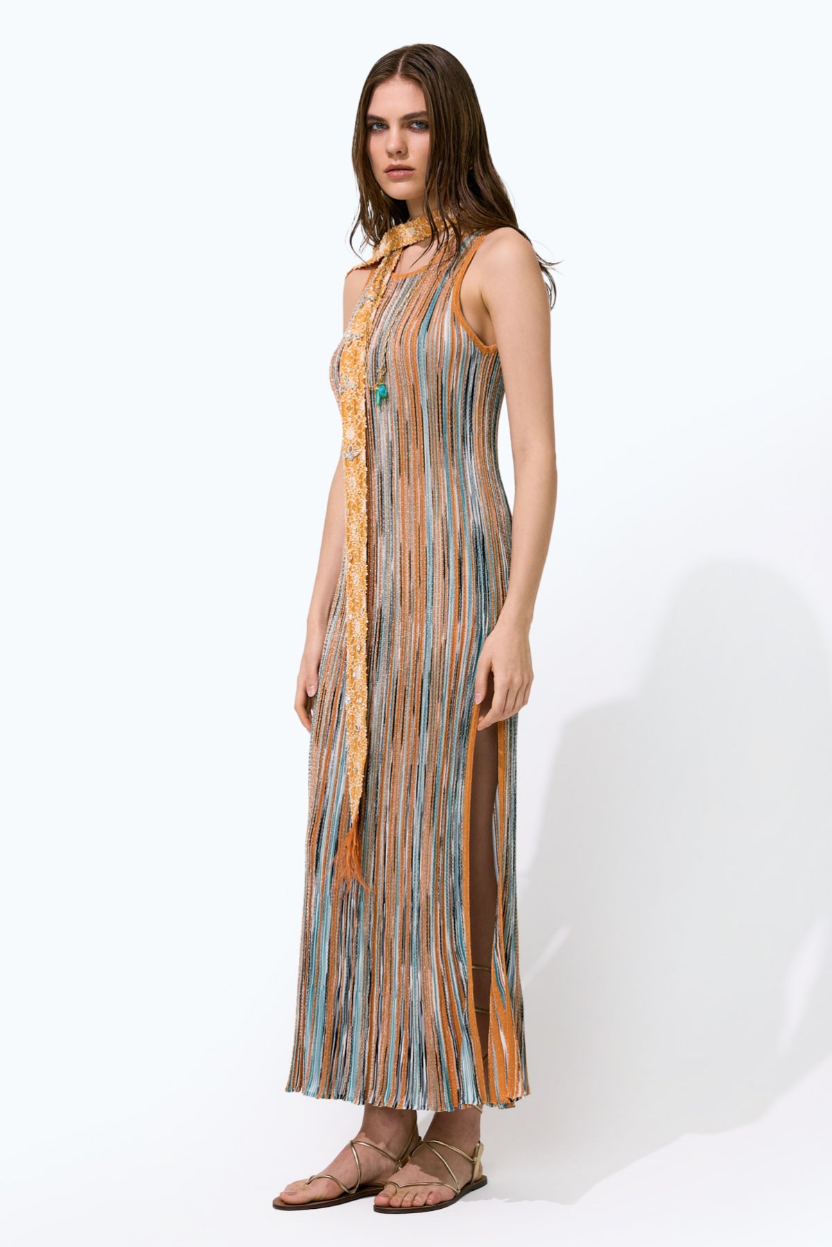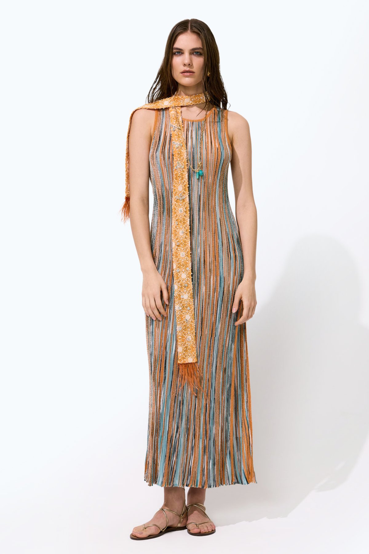 Simli Ajur Desenli Kolsuz Midi Boy Elbise Oranj - Multi - 3