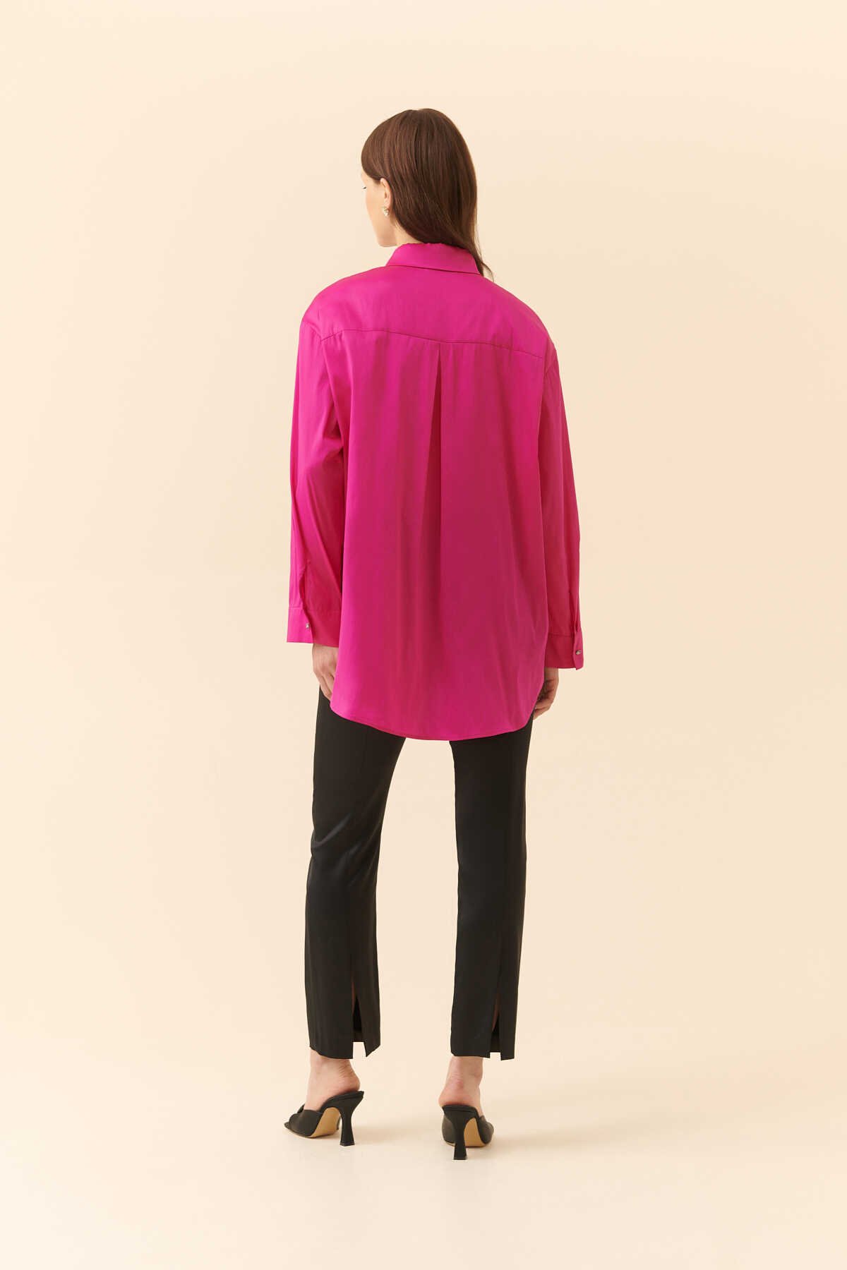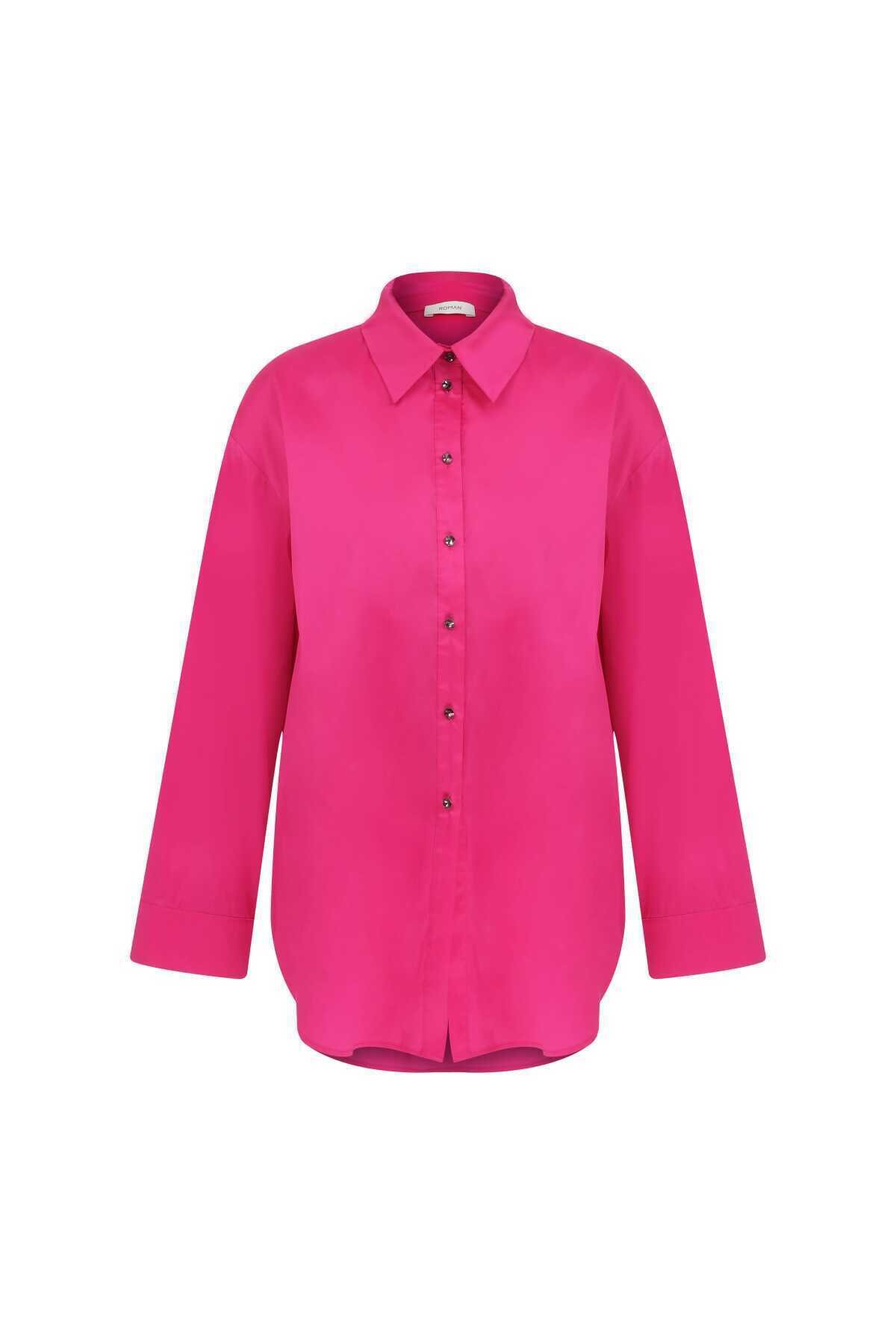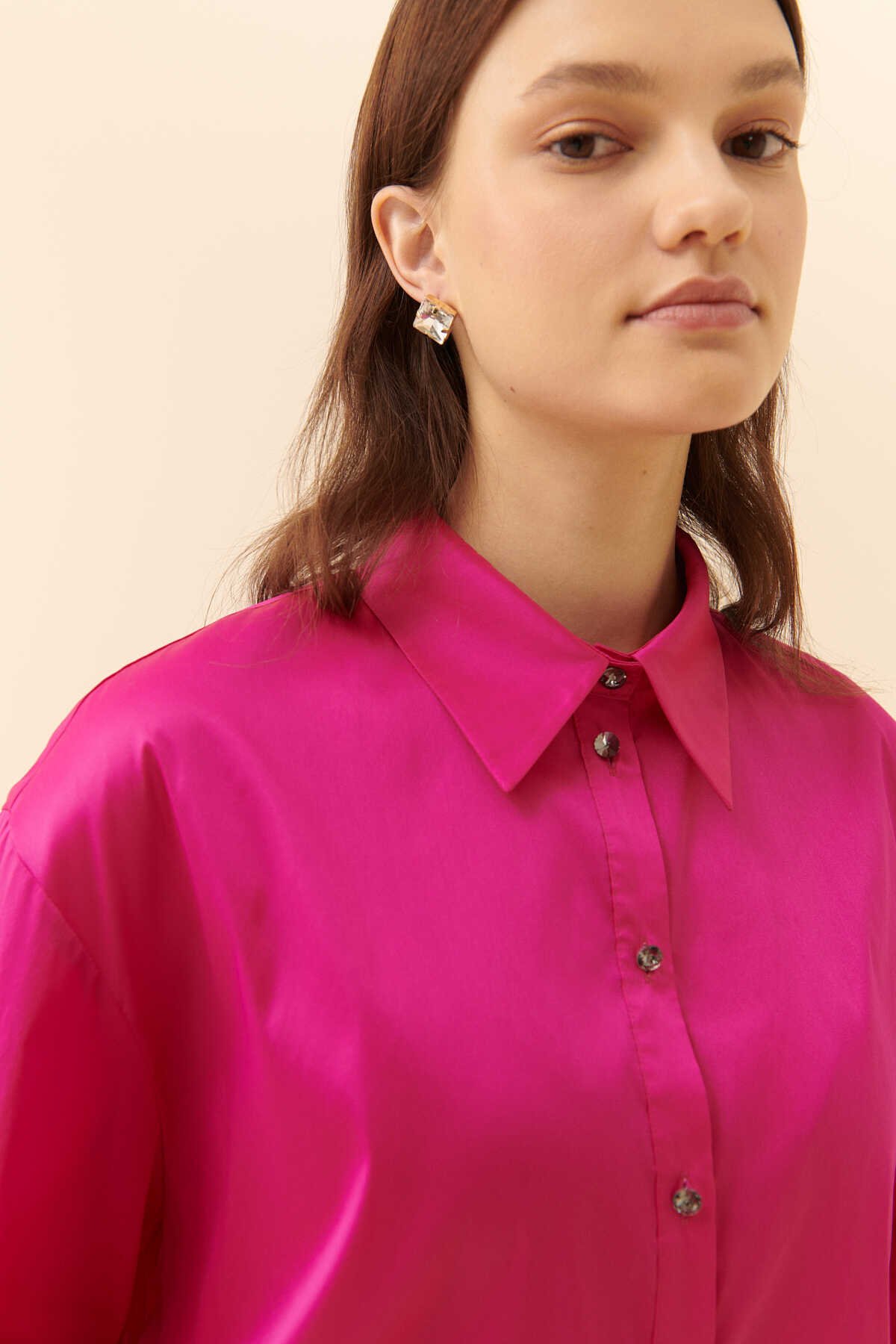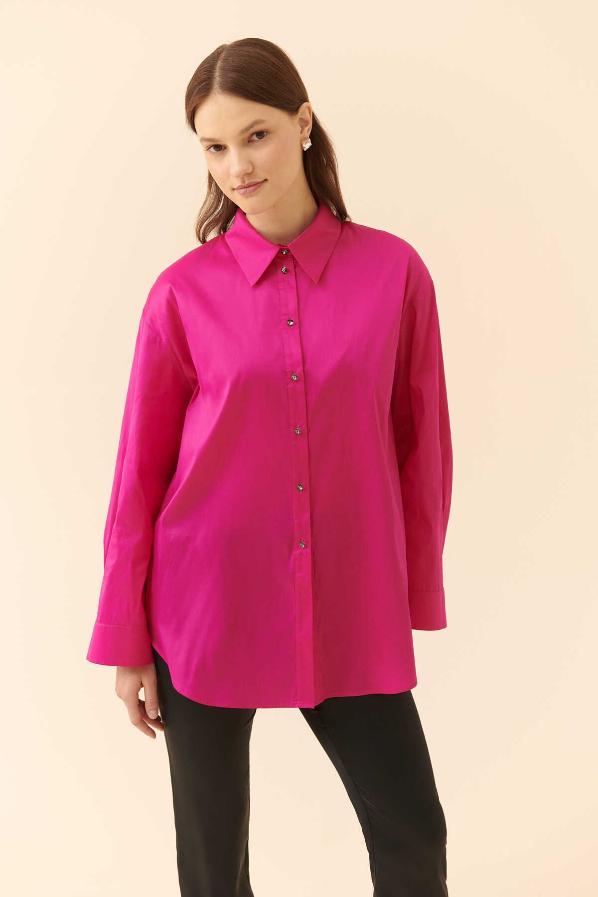 Taş Düğmeli Tafta Kadın Gömlek Fuşya