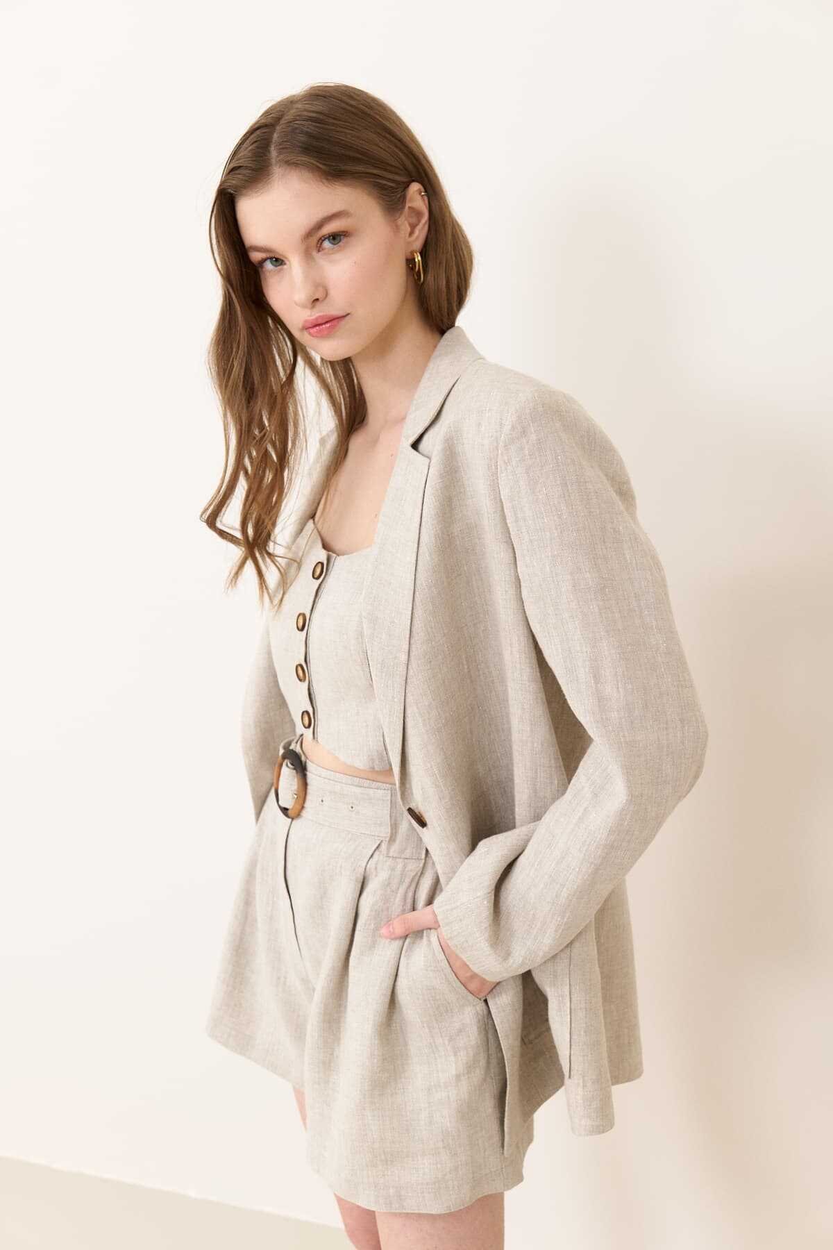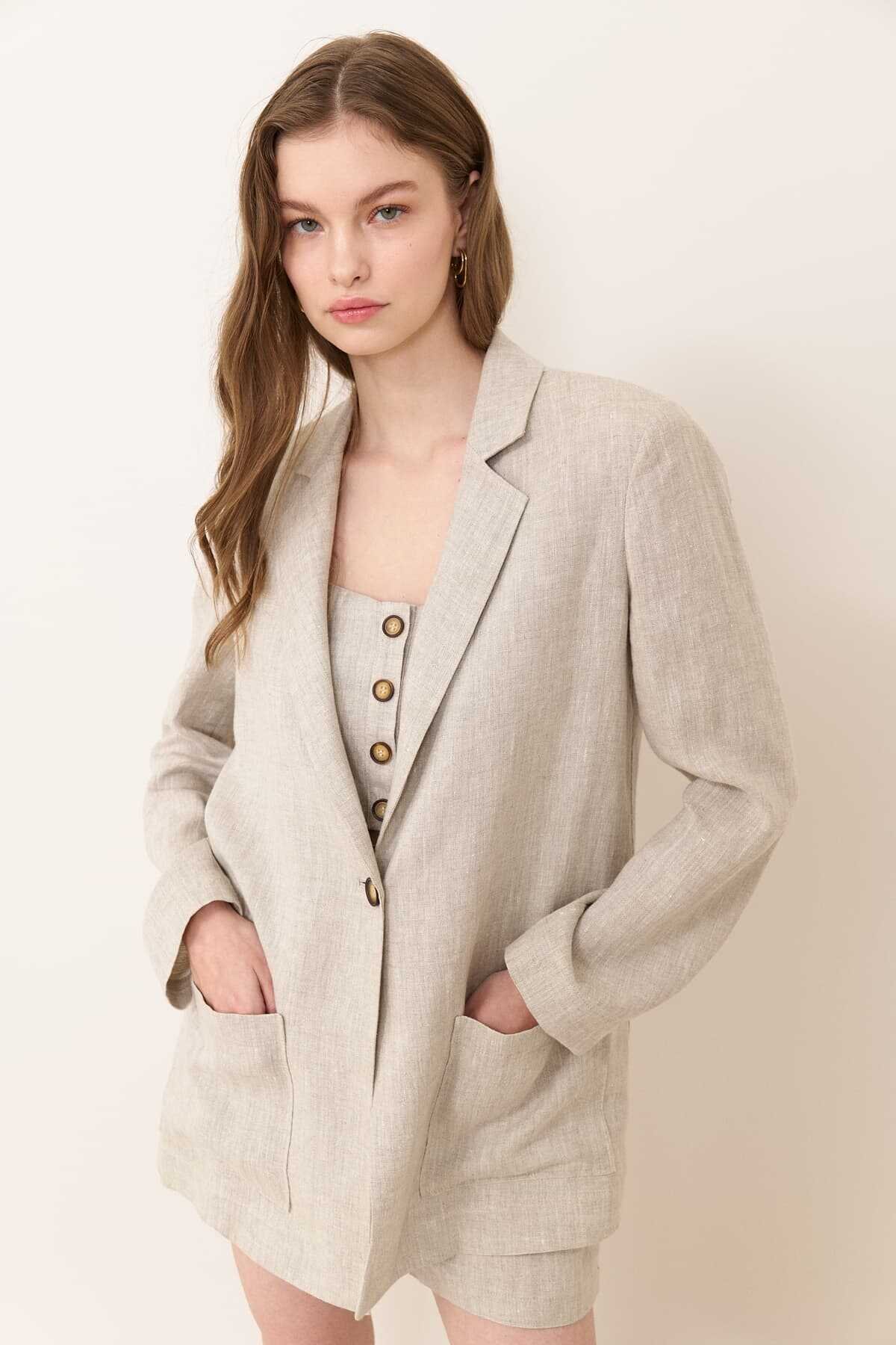 KUMAŞ İÇERİĞİ: Astar 1: %100 Pamuk ,Ana Kumaş: %100 Keten , YIKAMA TALİMATI: Makine Yıkama , Soğuk (30C veya 65F ile 85F) Tersten Yıkama Yapınız ÜTÜLEME TALİMATI: Düşük Isıda Ütüleme 110C Tersten Ütüleyiniz KURUTMA TALİMATI: Tamburlu Kurutma Yapılmaz ALT ÜRÜN GRUBU: tek düğmeli çift cepli keten ceket MODEL ÖLÇÜLERİ: