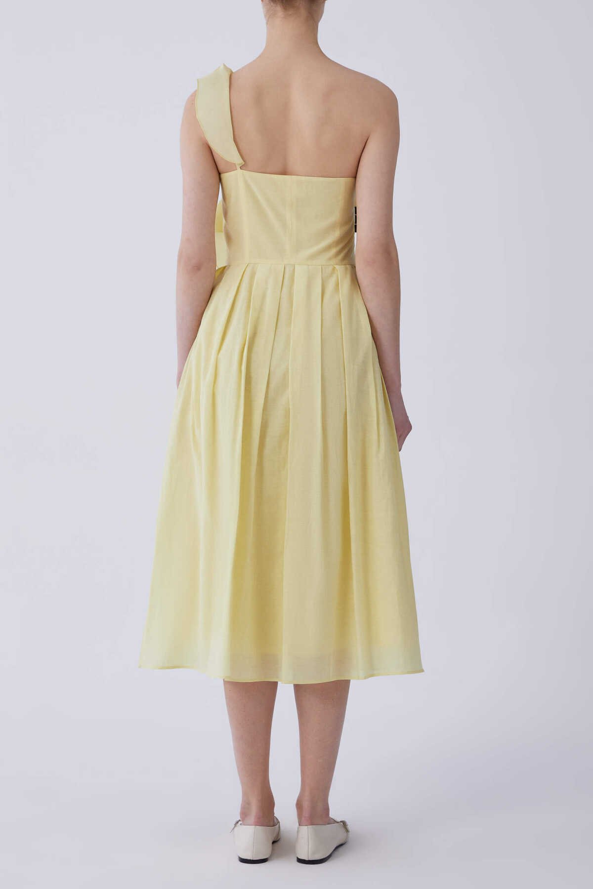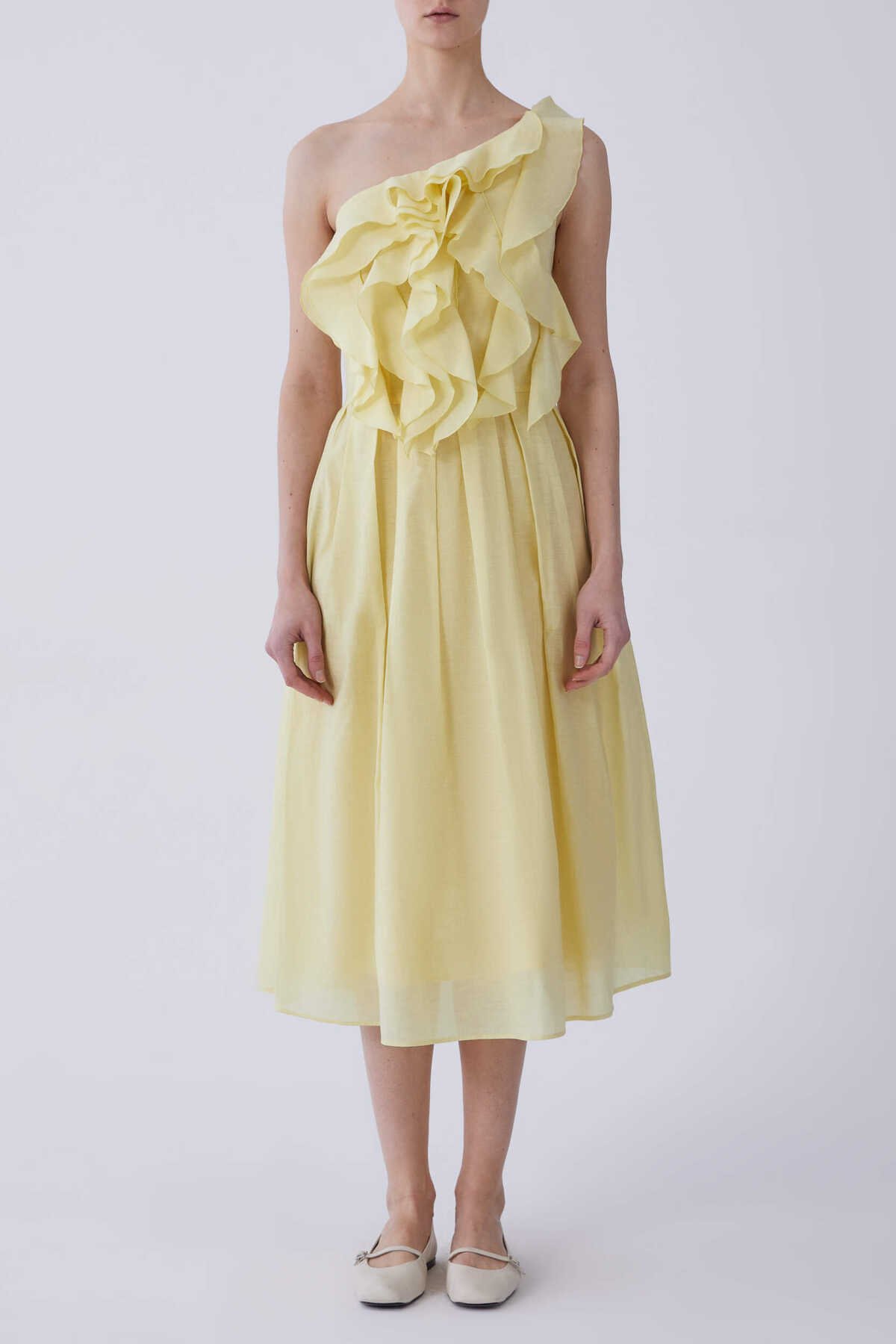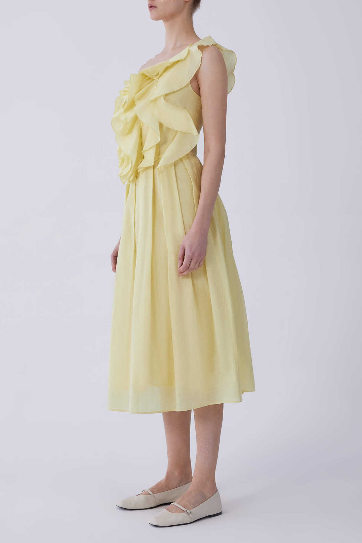 Tek Omuz Önü Fırfırlı Abiye Elbise Sarı
