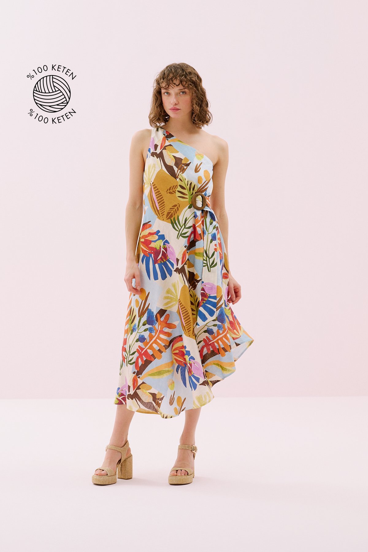 Tek Omuz Yandan Kemer ve Ahşap Toka Detaylı Keten Midi Elbise Standart Renk