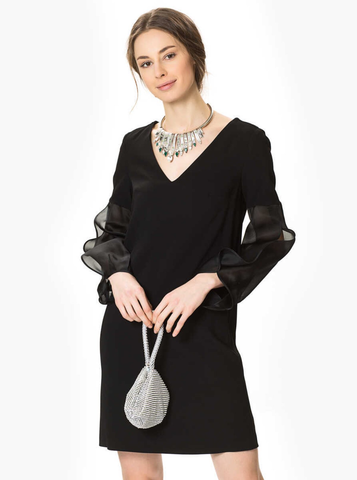 Fiyonk Detaylı Transparan Kollu Mini Elbise Siyah