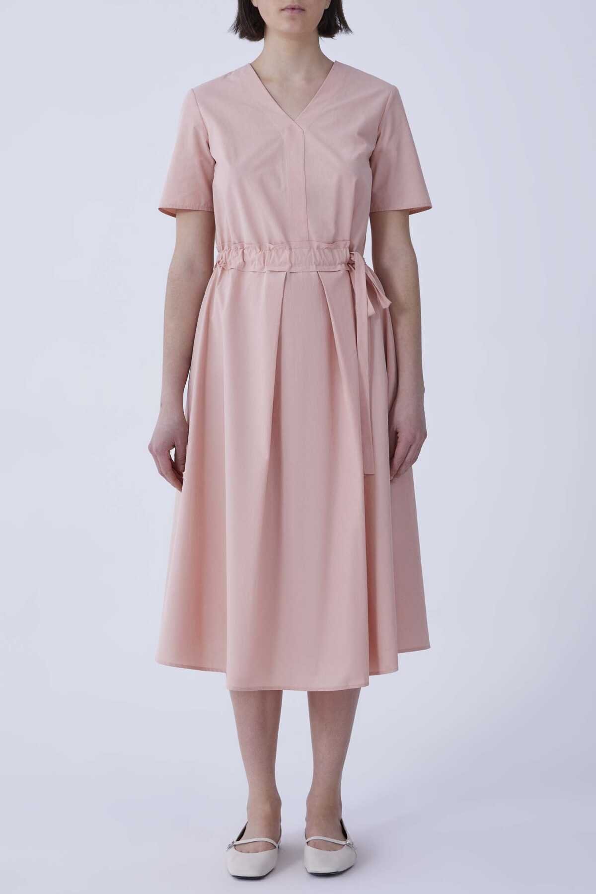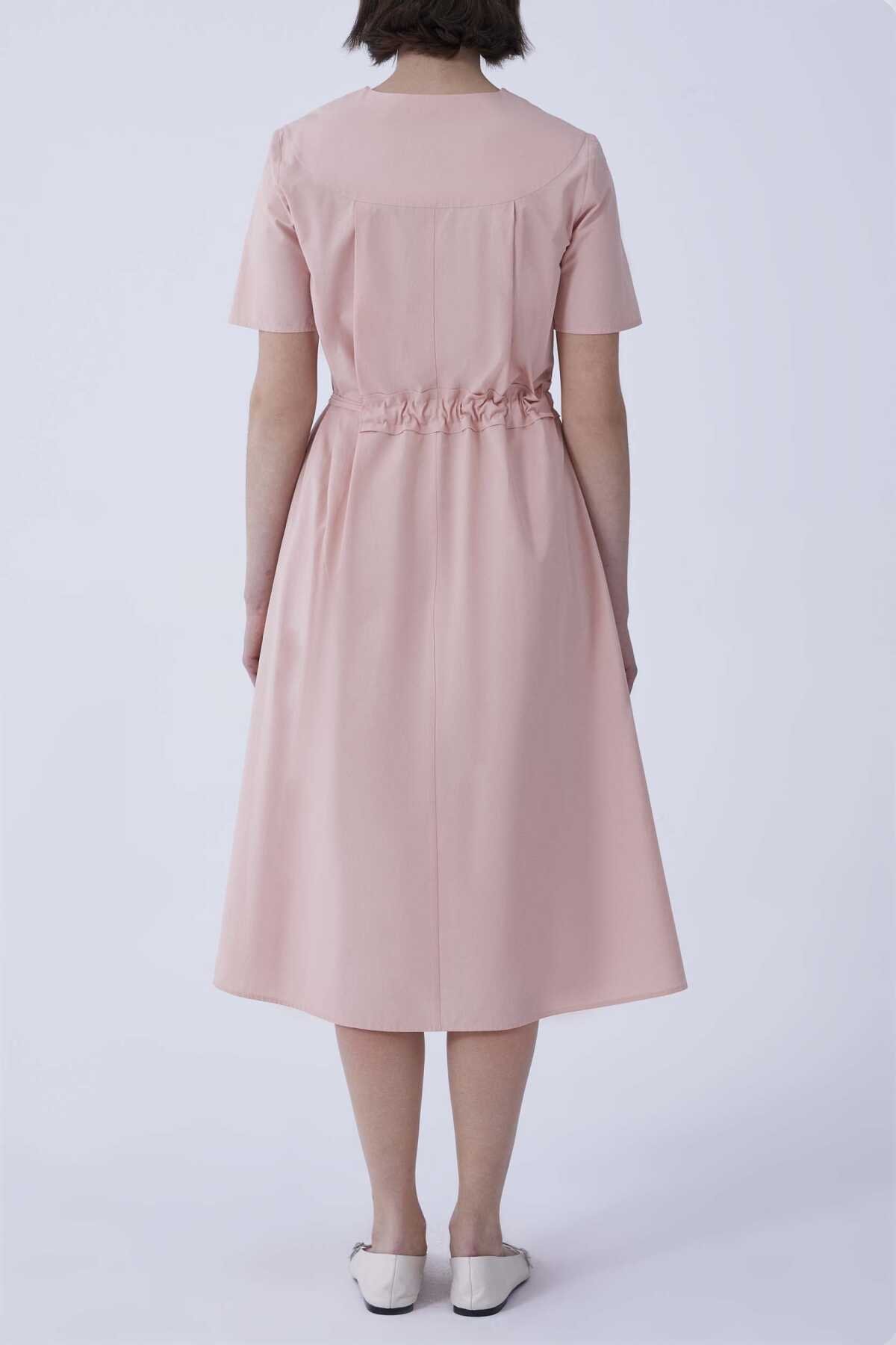 V Yaka Bel Detaylı Midi Elbise Pembe