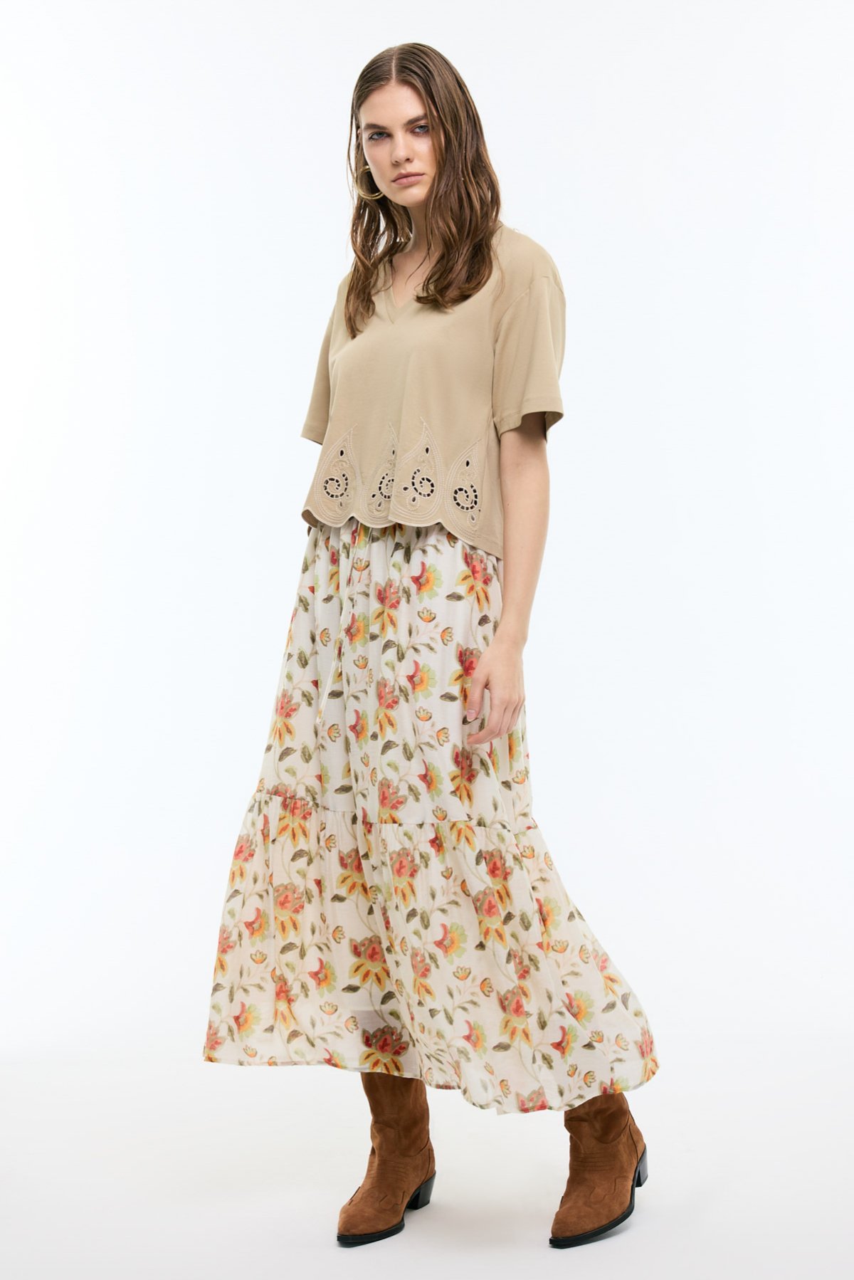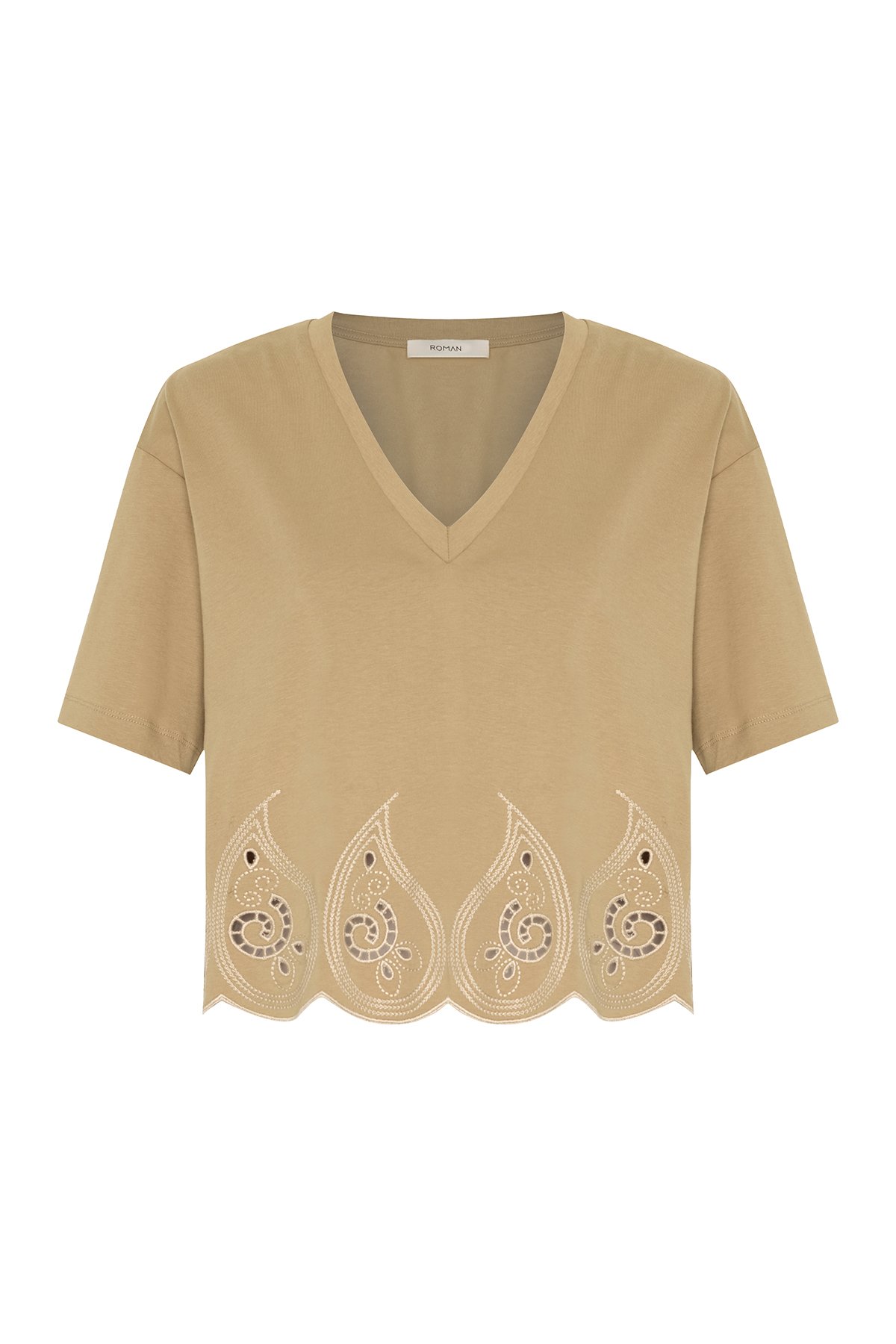V Yaka Embrode Nakışlı T-shirt Kahve - 1