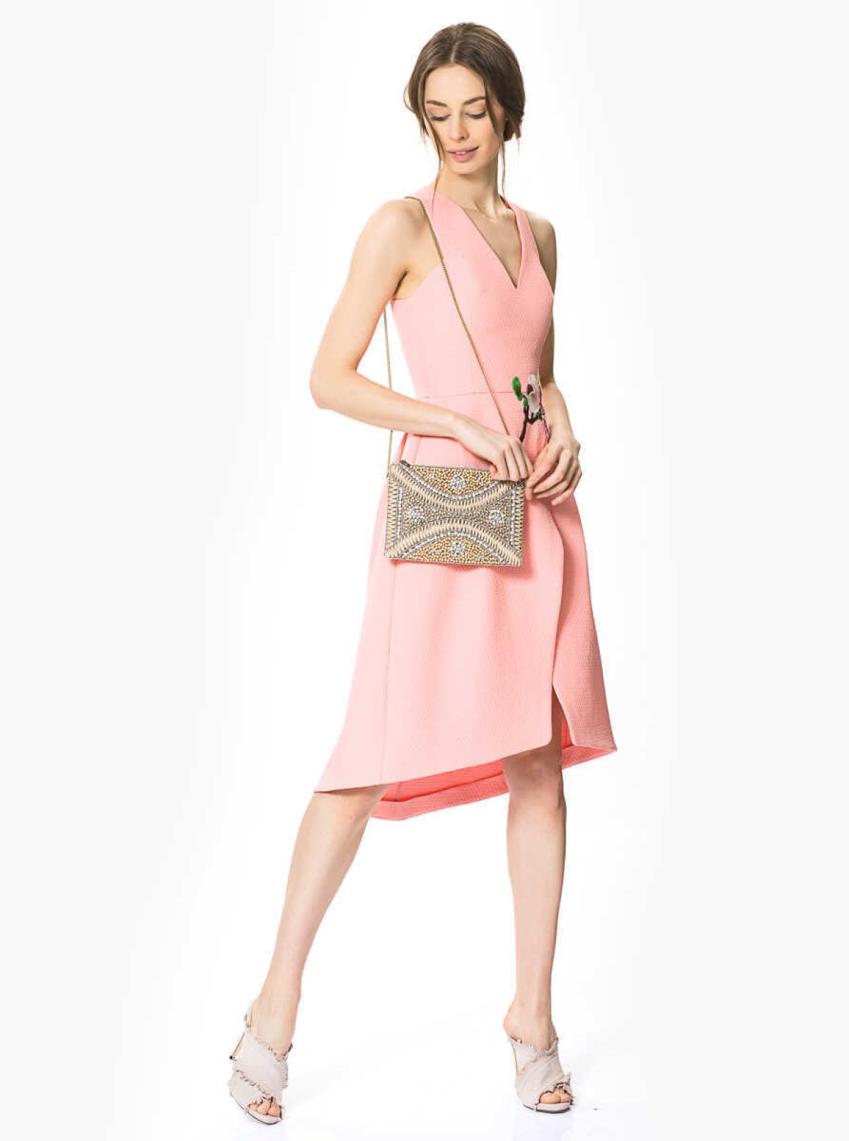 V Yakalı Aplikeli Abiye Elbise Pembe