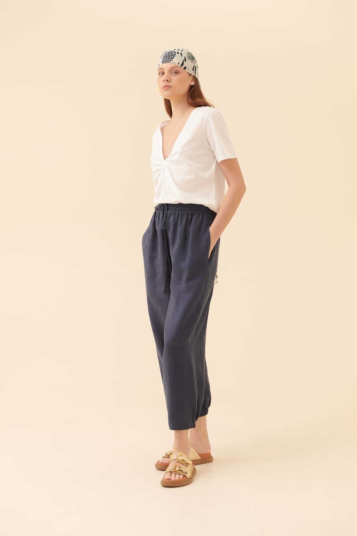 Beli Bağlamalı Kısa Paça Pantolon Lacivert