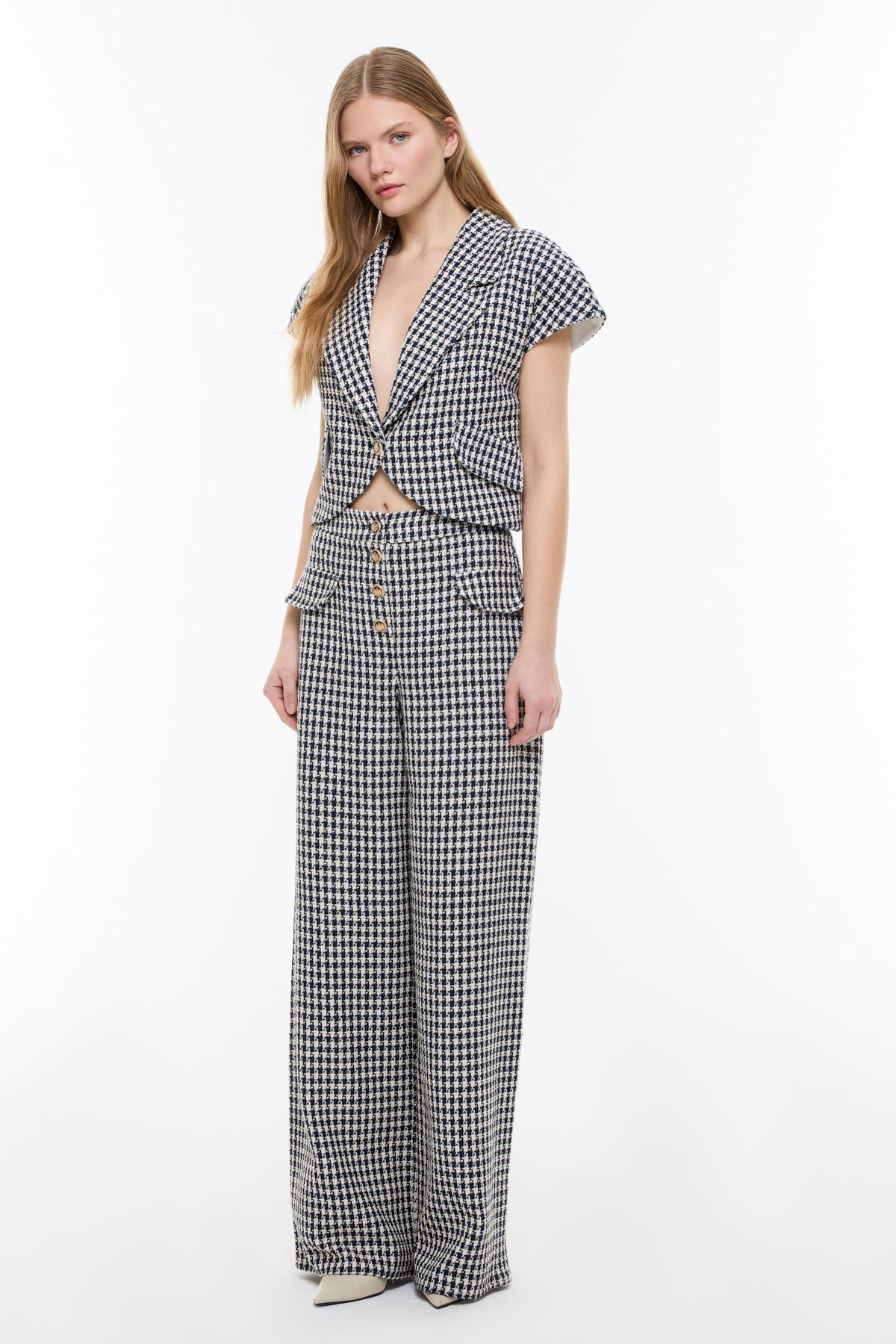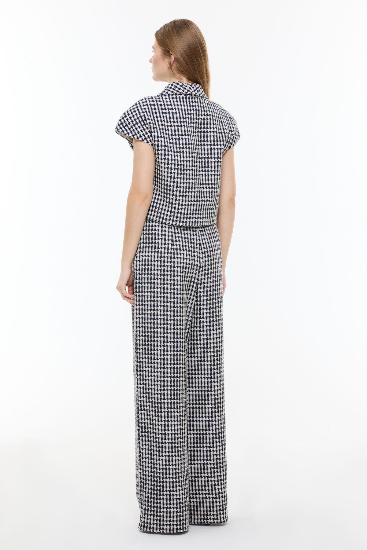 Kazayağı Desenli Geniş Paça Pantolon Lacivert - Beyaz