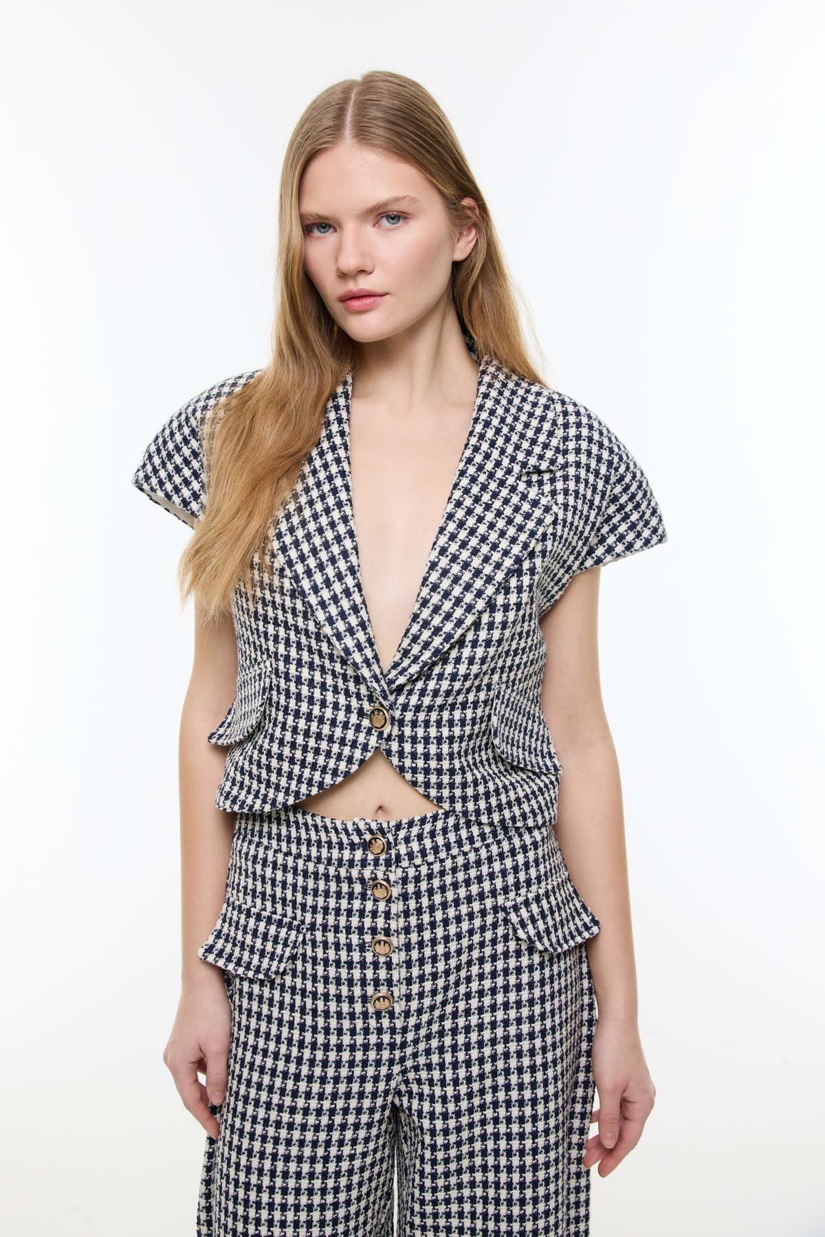 Kazayağı Desenli Tek Düğmeli Ceket Lacivert - Beyaz