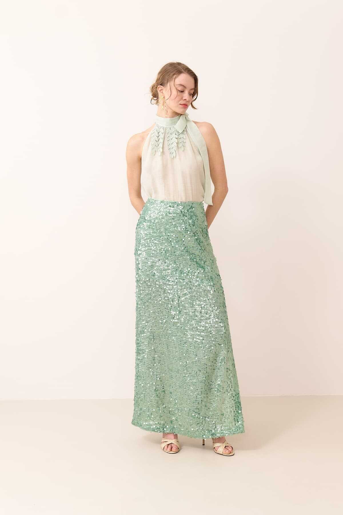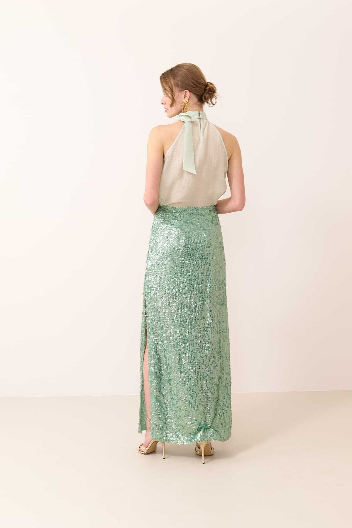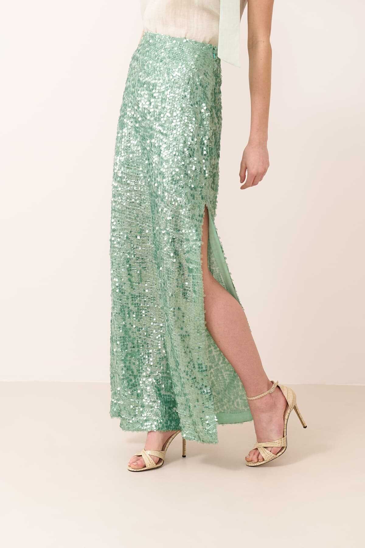 Yandan Yırtmaçlı Payet Etek Mint