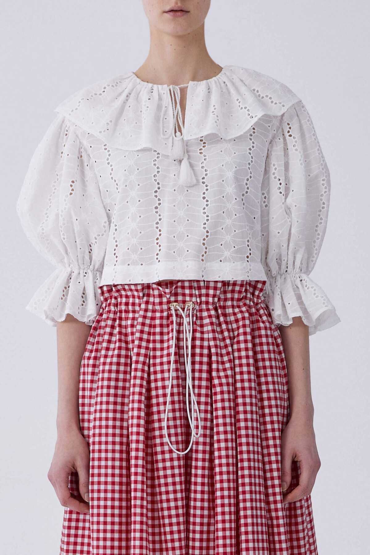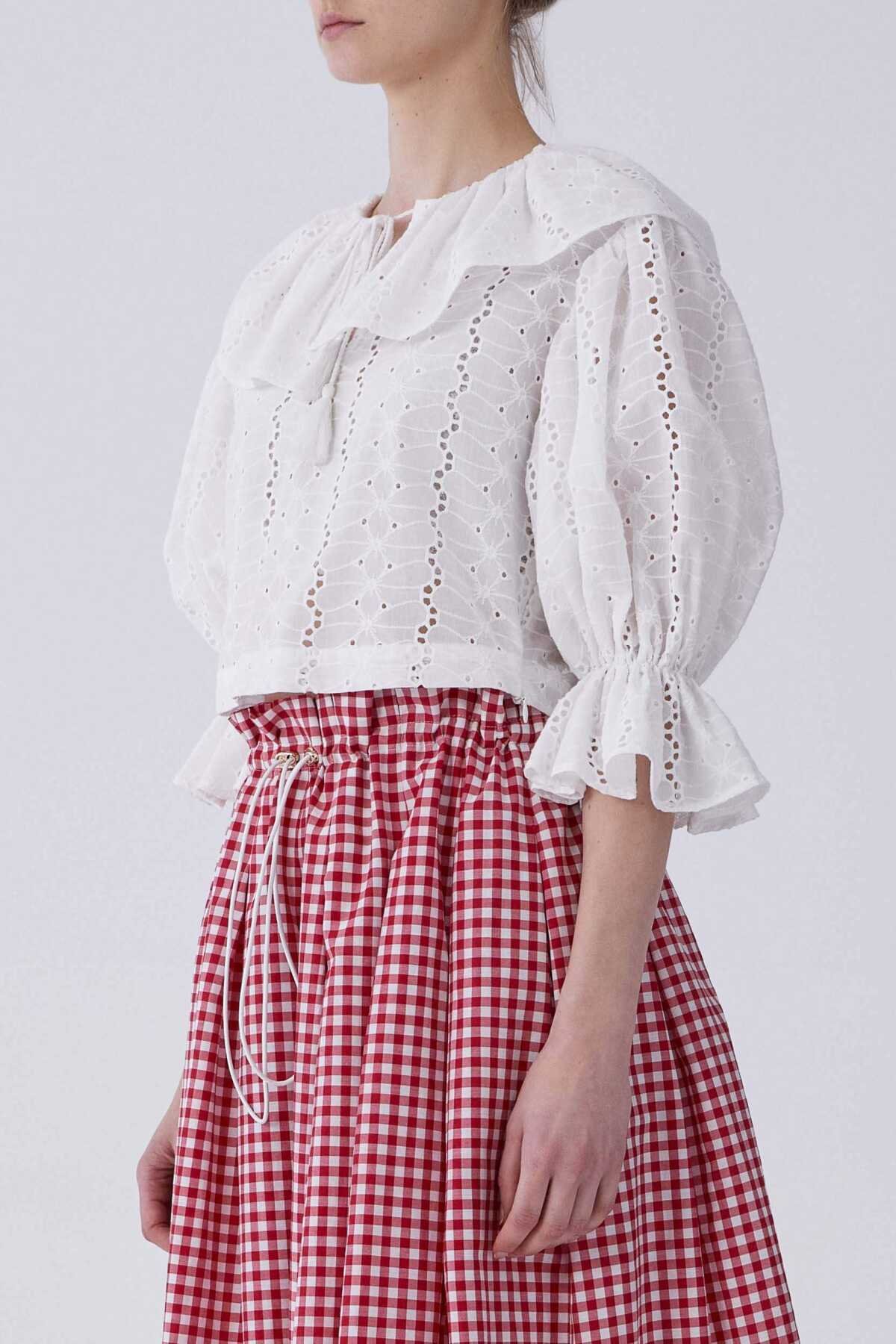 Yakası Volanlı Dantel Kısa Bluz Beyaz