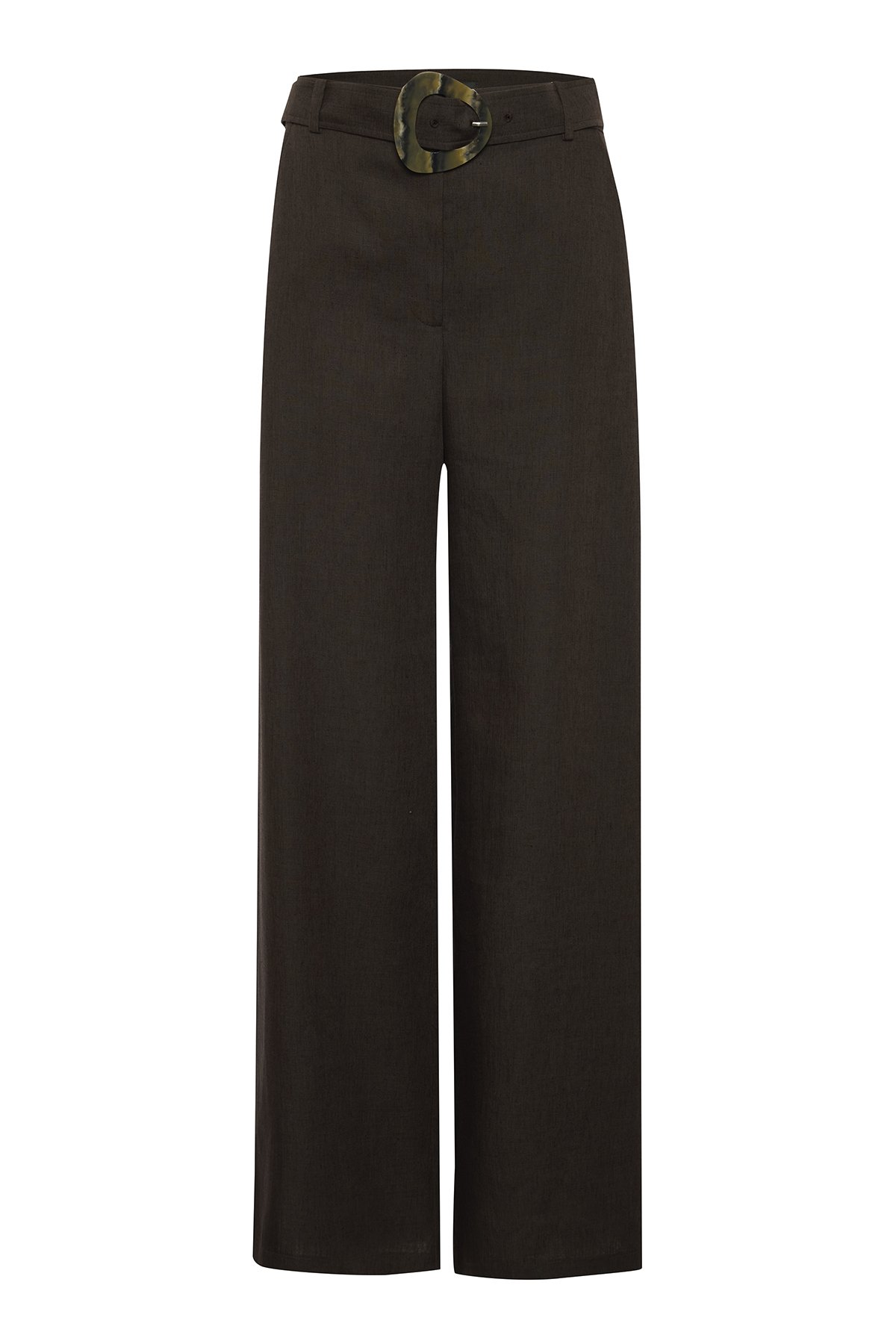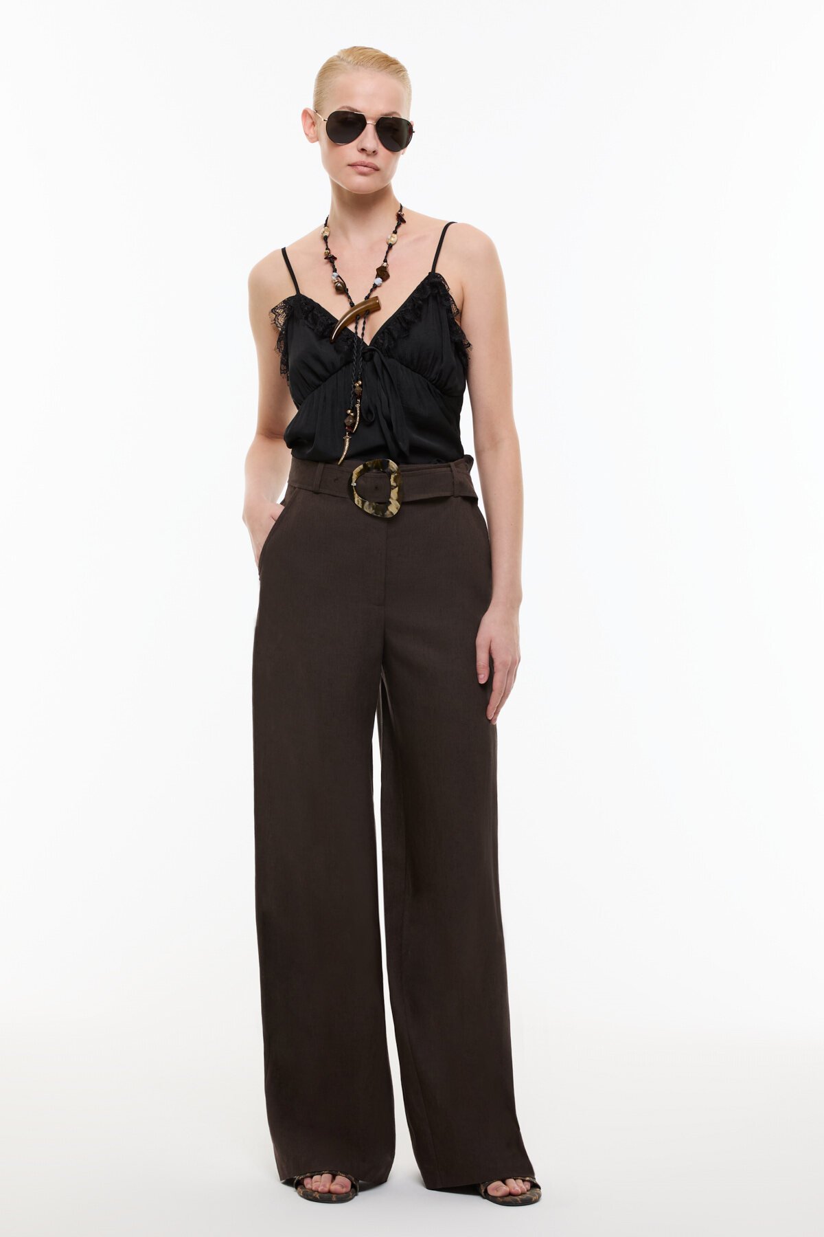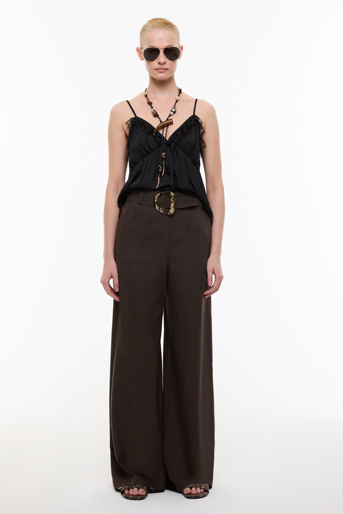 Yüksel Bel Geniş Paça Kemer Detaylı Keten Pantolon Kahve - 1