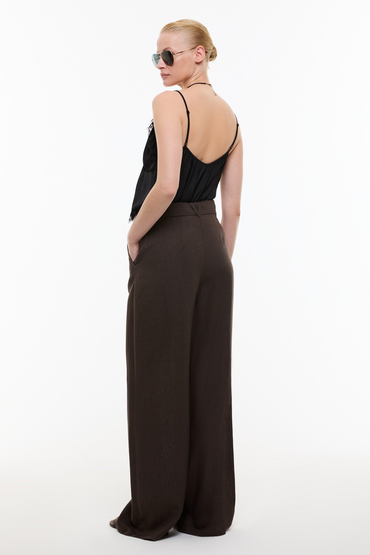 Yüksel Bel Geniş Paça Kemer Detaylı Keten Pantolon Kahve - 3
