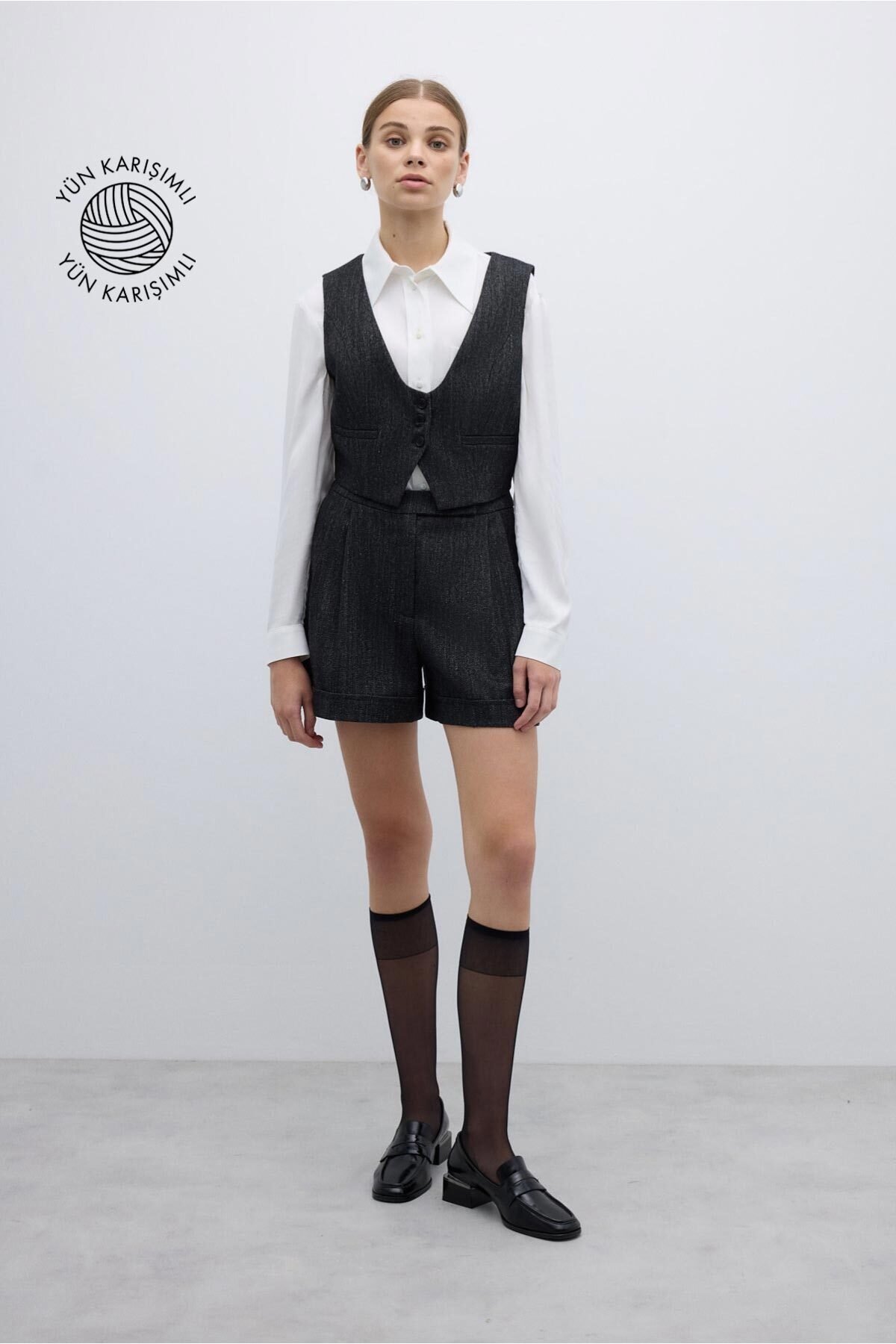 Yün Karışımlı Çift Pileli Şort Siyah - 1